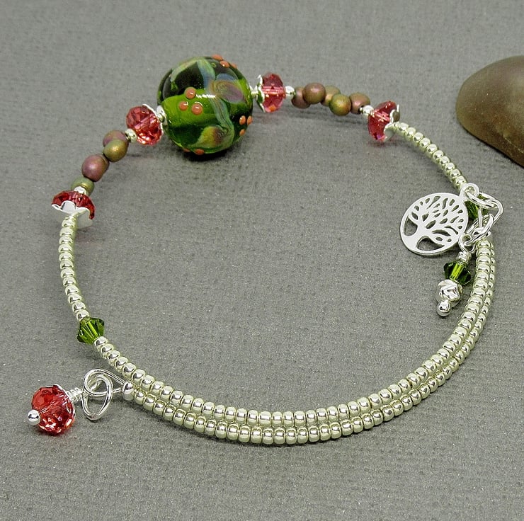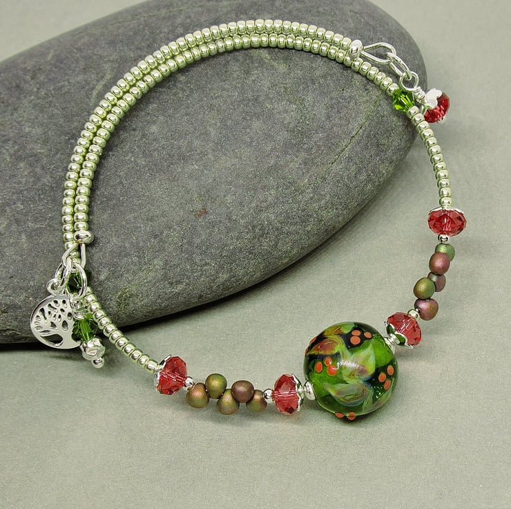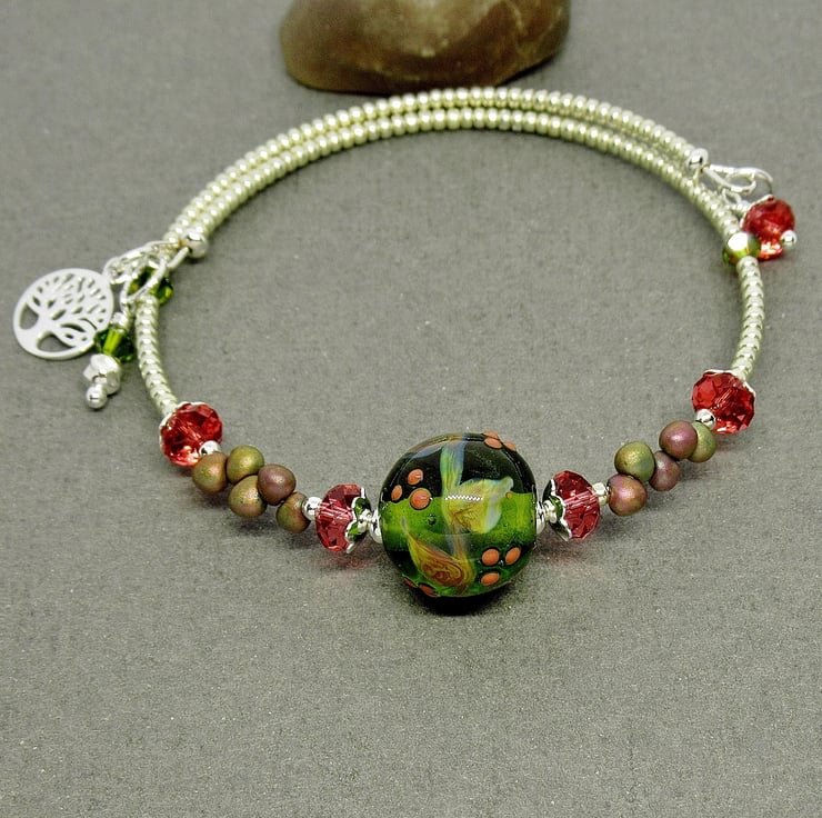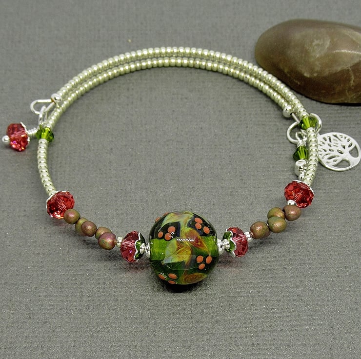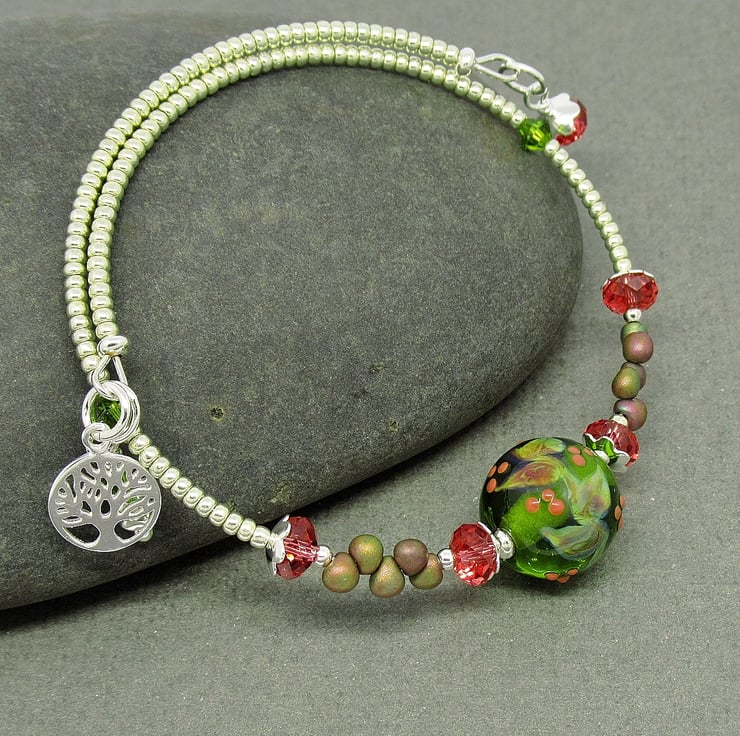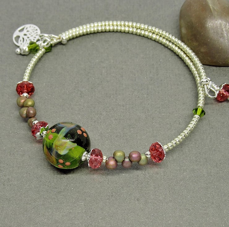 Comfortable and easy to wear silver memory wire bracelet featuring a green artisan lampwork glass bead with surface berry and leaf detail. I have complimented this lovely bead with toning Swarovski crystals, glass drop beads, sterling silver beads and silver Myuki glass seed beads.