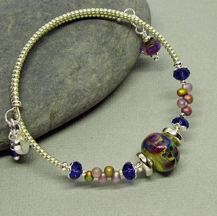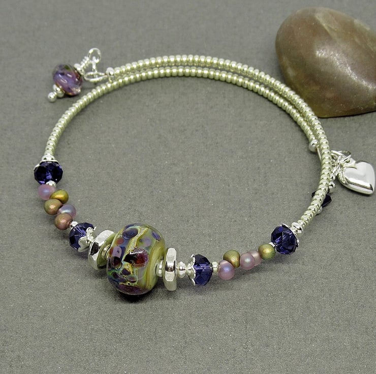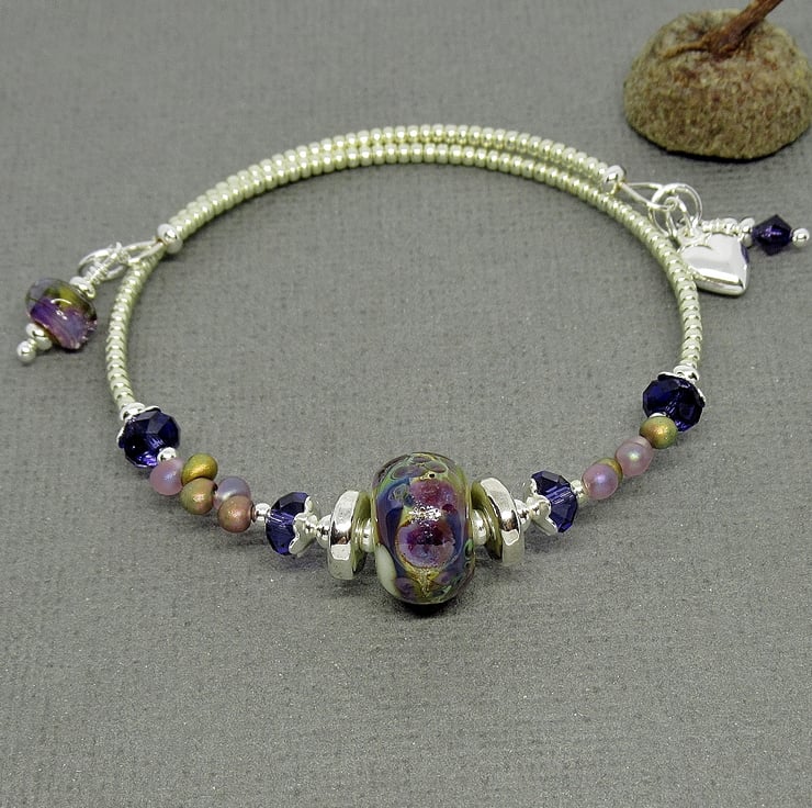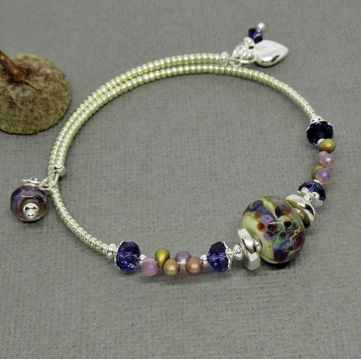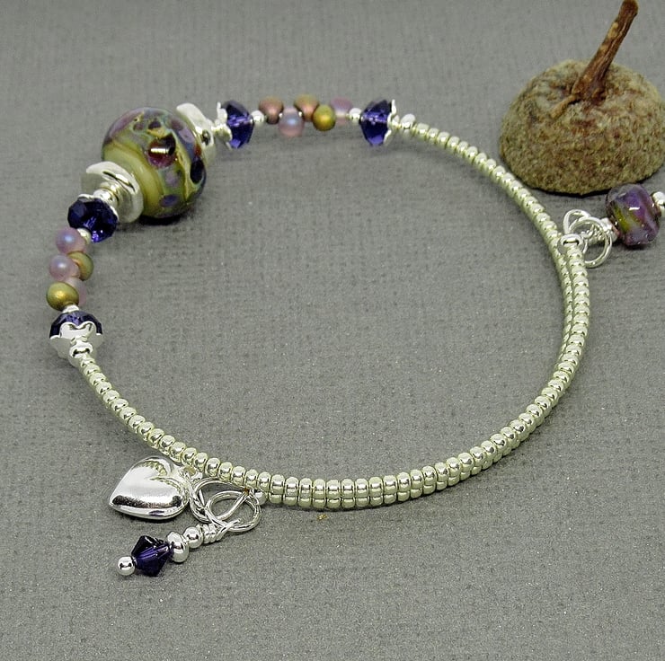 I have complimented the central bead with Swarovski crystal rondelles in Velvet Purple, silver Greek ceramic disc beads, glass drop beads, and silver Miyuki seed beads. This lovely bracelet has been finished with sterling silver beads, a sterling silver heart charm and co-ordinating beaded charms.