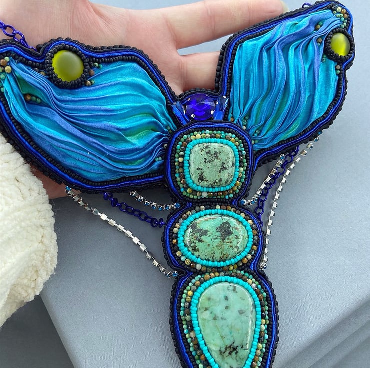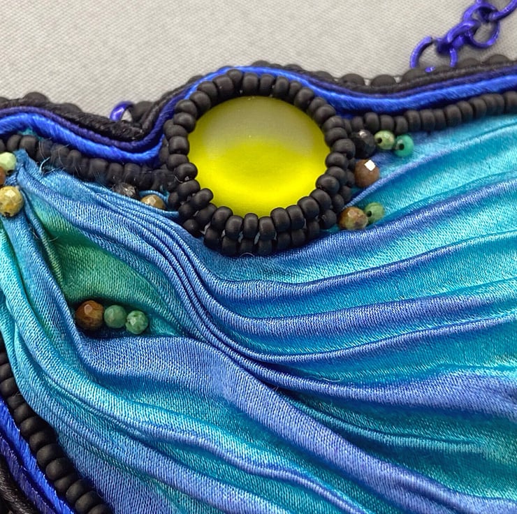 A striking bib style necklace featuring turquoise cabochons and rounds, Austrian crystal, Swarovski cup chain, shibori silk and 2 Luna cabochons suspended from a navy blue plated copper belcher chain.