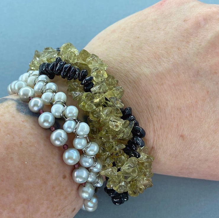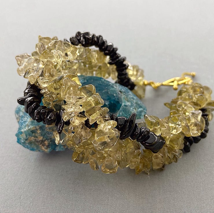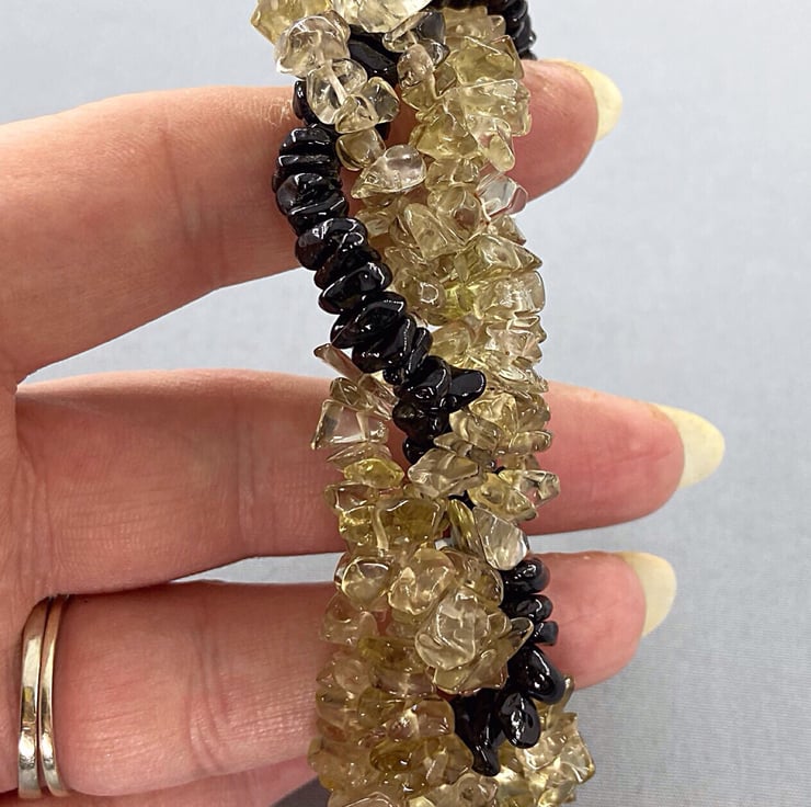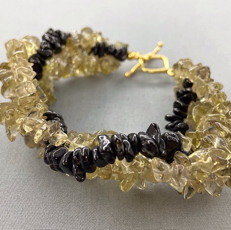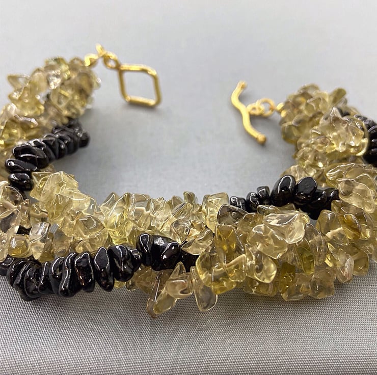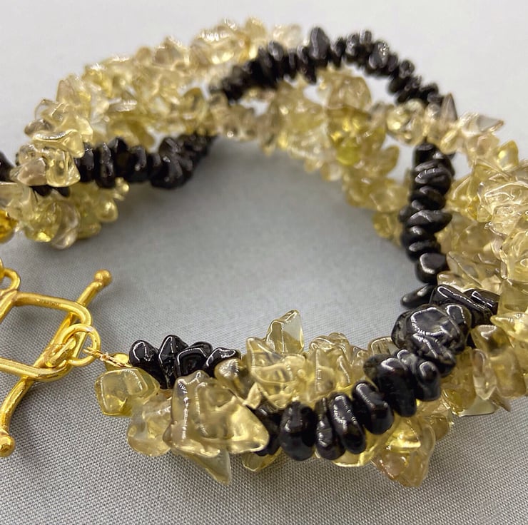 A lovely full gemstone bracelet featuring lemon quartz and black spinel entwined together to give that twisted rope effect which fastens with a gold filled toggle clasp.