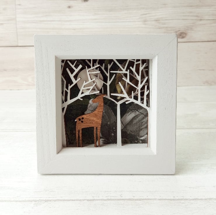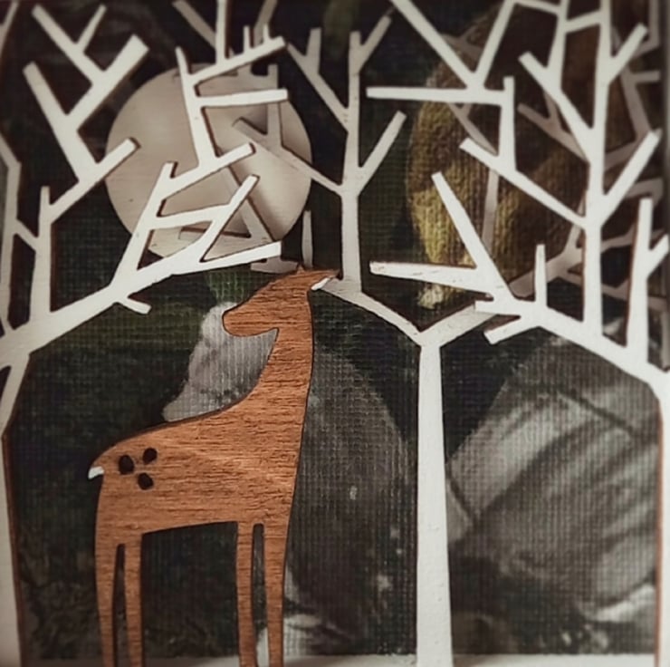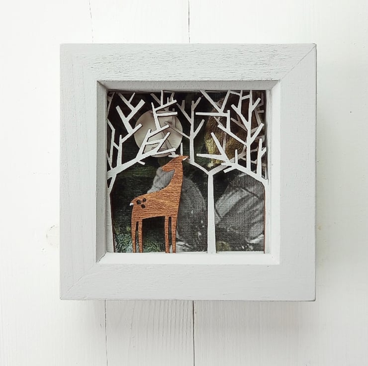 This gorgeous miniature diorama picture features a deer in a moonlit winter forest, and is inspired by my love of nature, folklore and my time working on stage sets in the theatre.