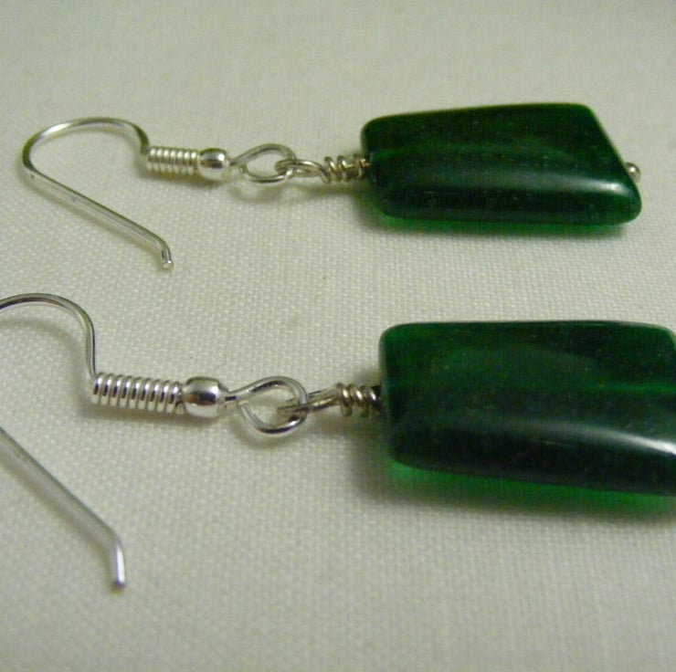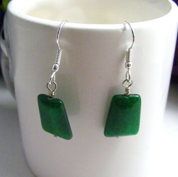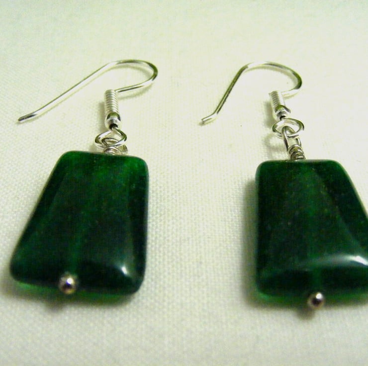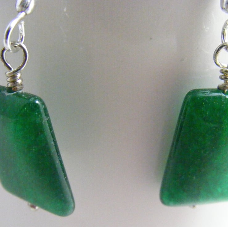 Gemstone earrings are handmade with, 19 x 13 mm green agate trapezoids, silver plated headpins and ear wires.
