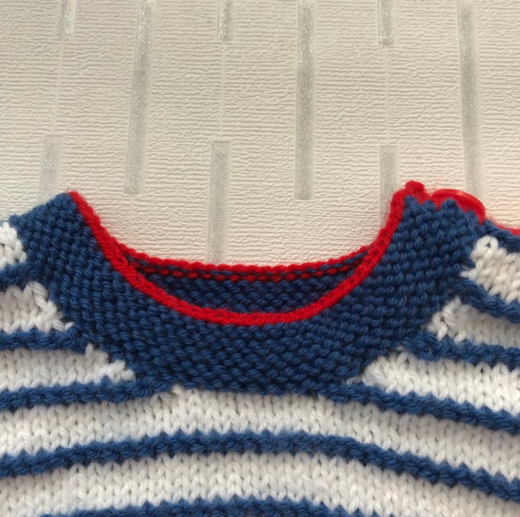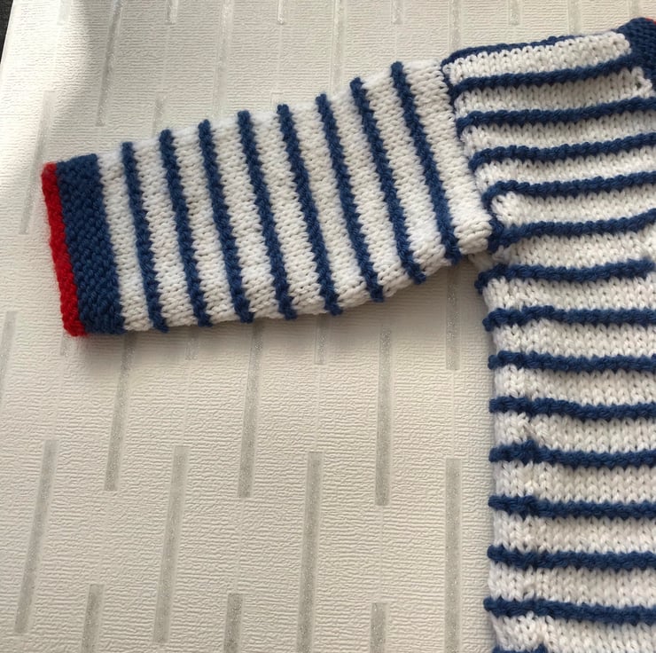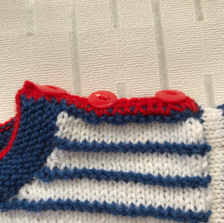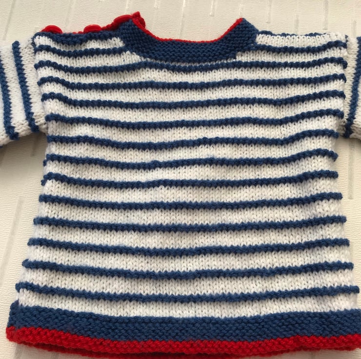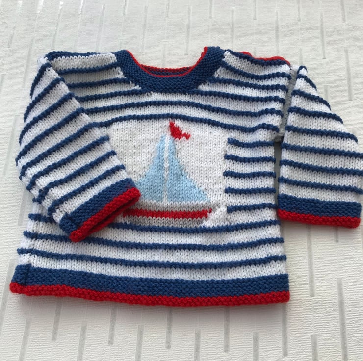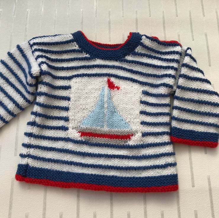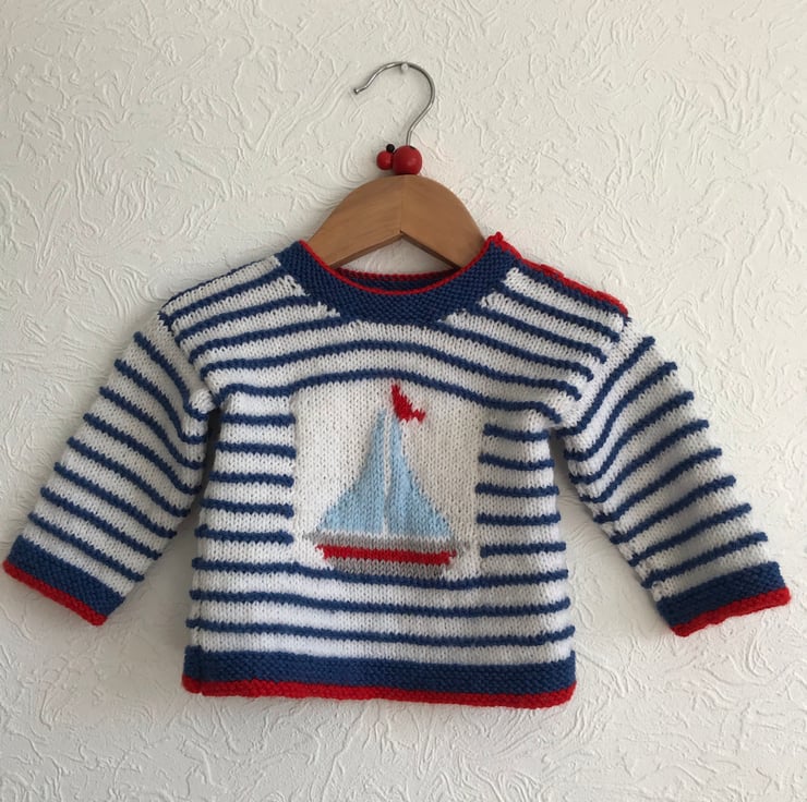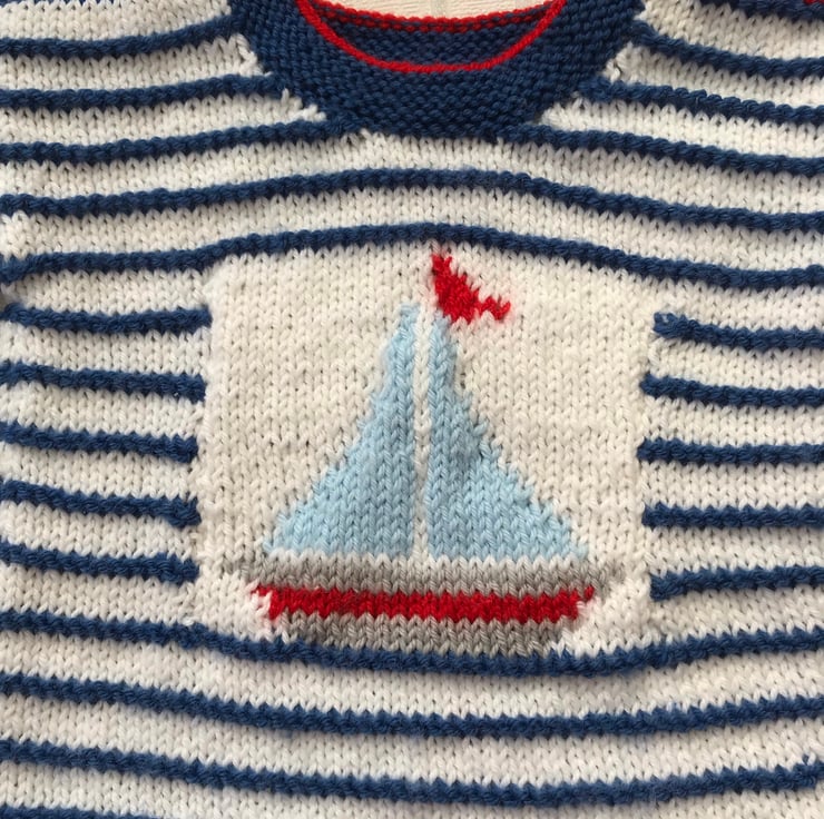 This nautical jumper is hand knitted in a soft luxury wool and nylon yarn. It is worked in white with blue stripes and edged in red. There is a picture panel on the front featuring a sailing boat in grey and red with pale blue sails. It fastens on the shoulder with three red buttons.