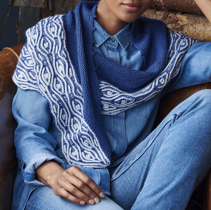 2 stitch techniques are brought together in this glorious draping shawl. Firstly a narrow band of 2 coloured brioche is worked; starting off from a point and ending off at a point with 14 pattern repeats in between.