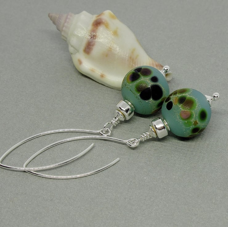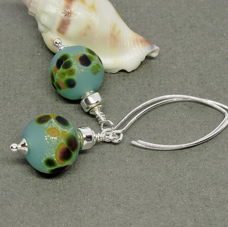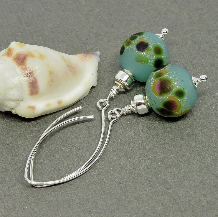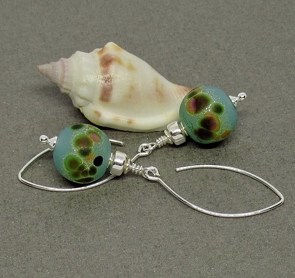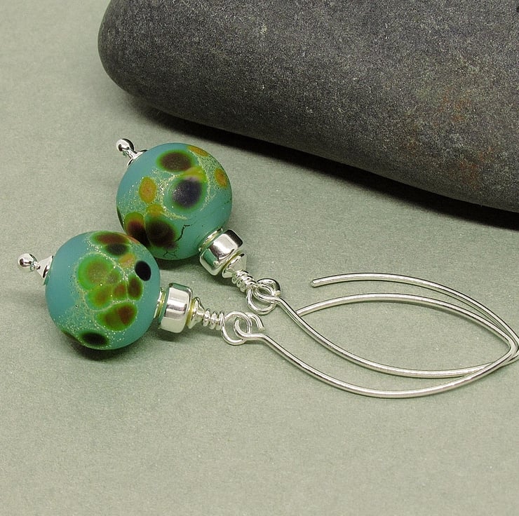 Frosted turquoise glass bead earrings featuring lampwork beads handmade by a UK glass artist. These pretty lampwork beads are made from semi opaque turquoise glass with surface detail in browns and pinks with faint silver trails, they have been etched for a soft frosted sea glass look and have been complimented by sterling silver beads, headpins and ear wires.