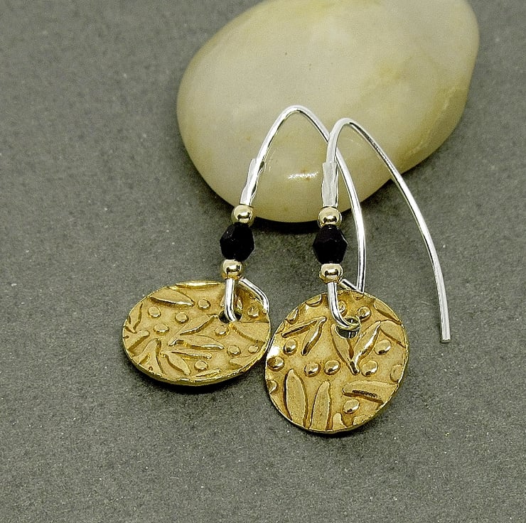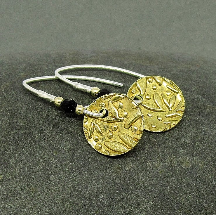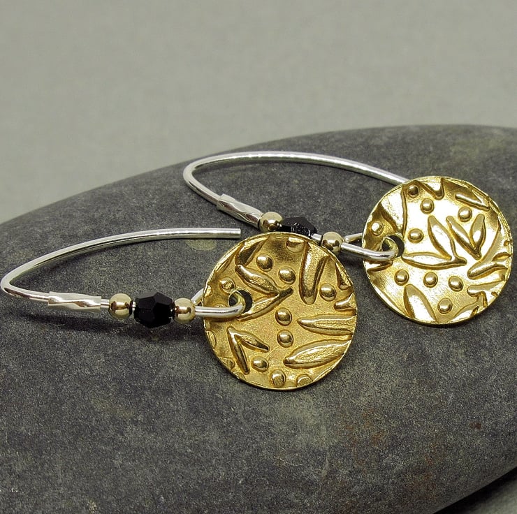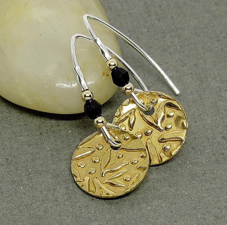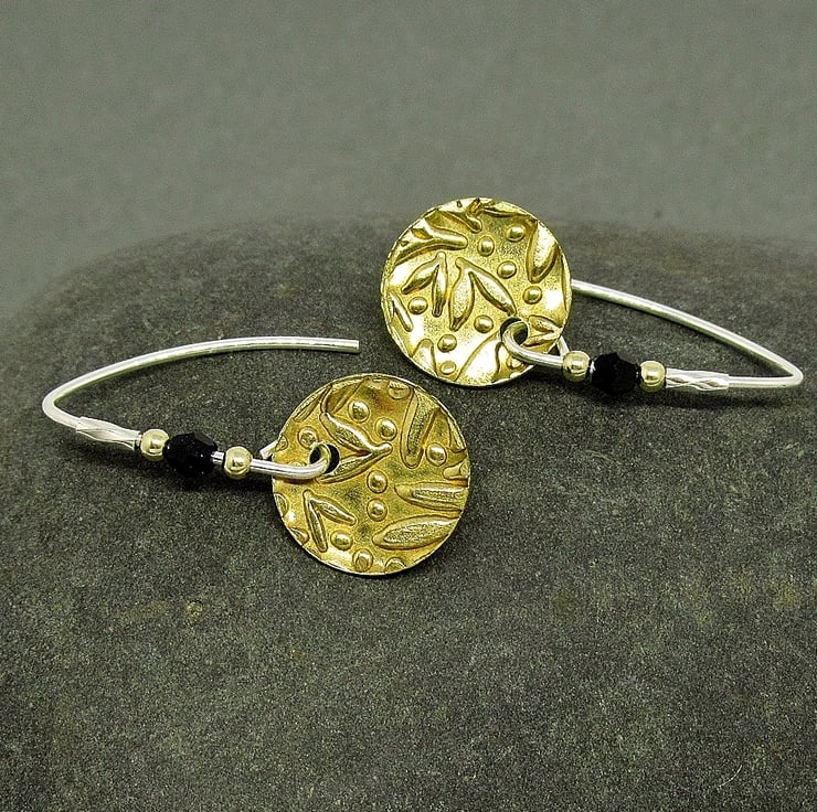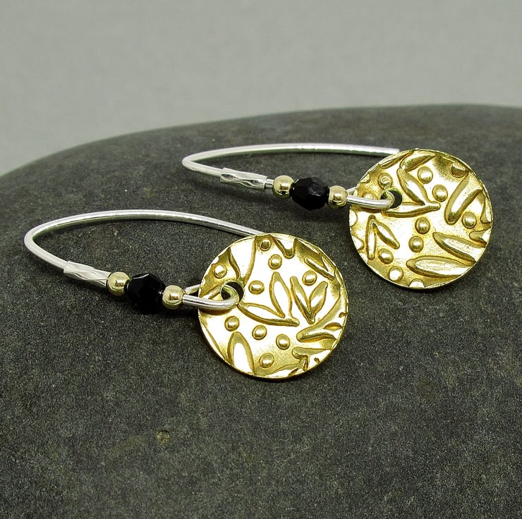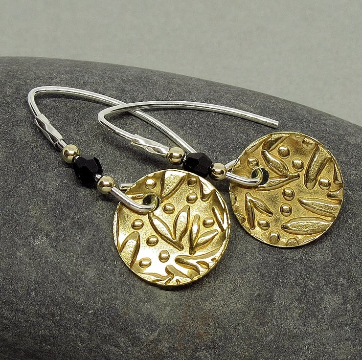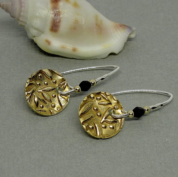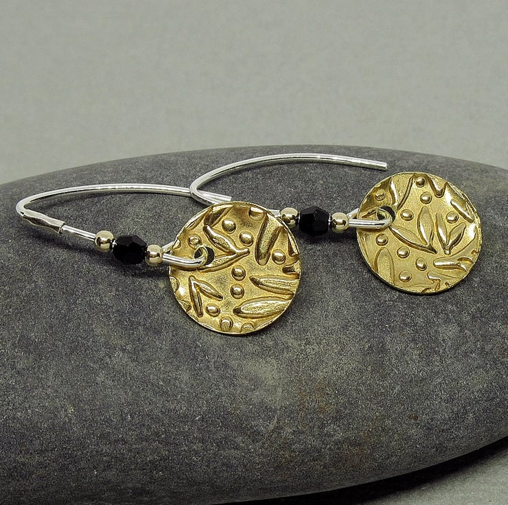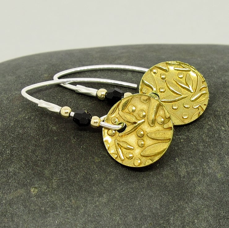 Delicate earrings featuring embossed brass discs suspended from handmade sterling silver ear wires. The ear wires have been enhanced by tiny Swarovski jet crystals, gold beads and twisted silver tubes.