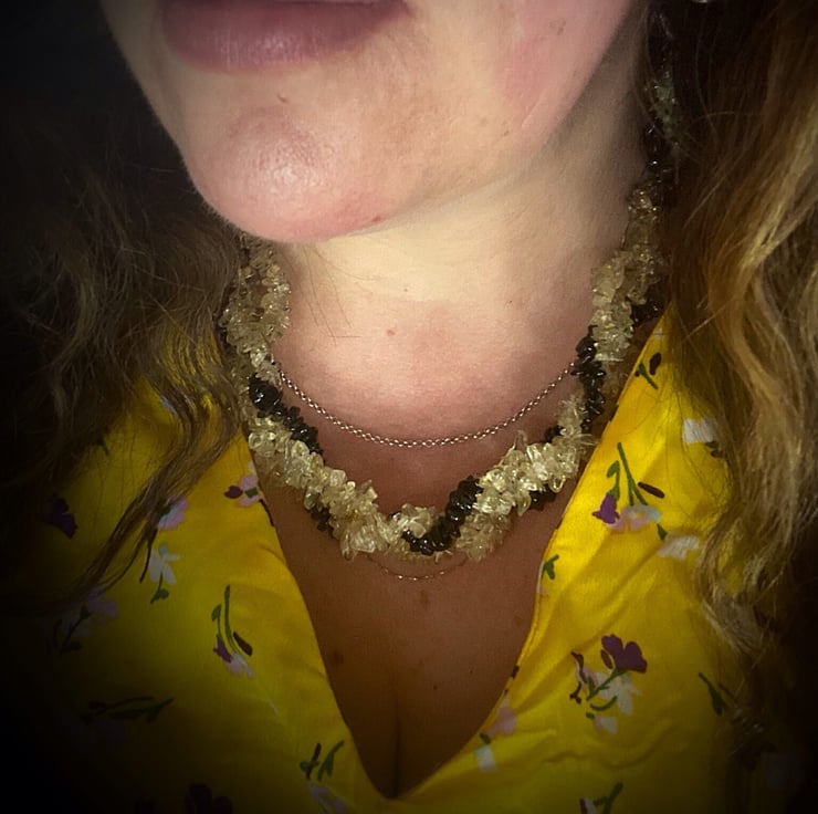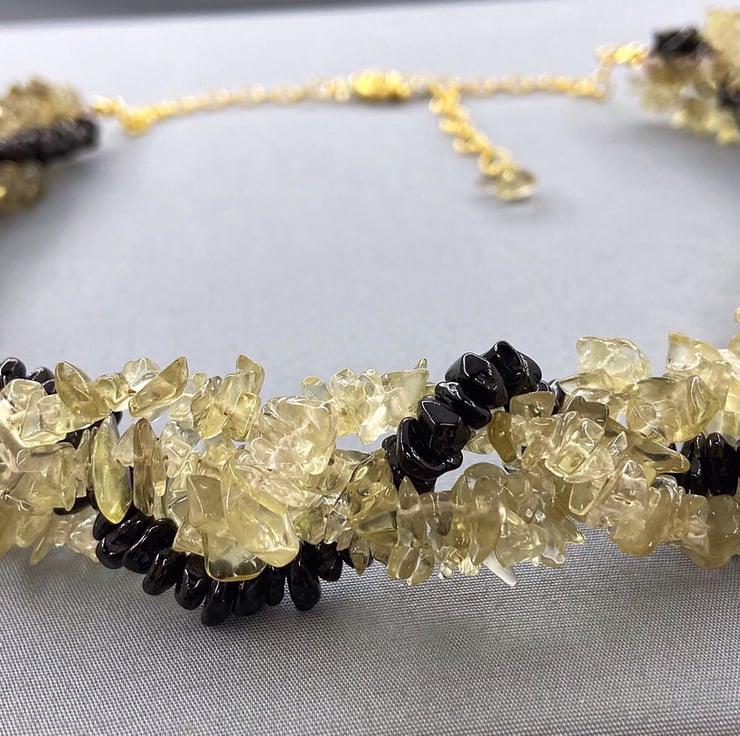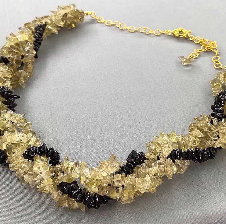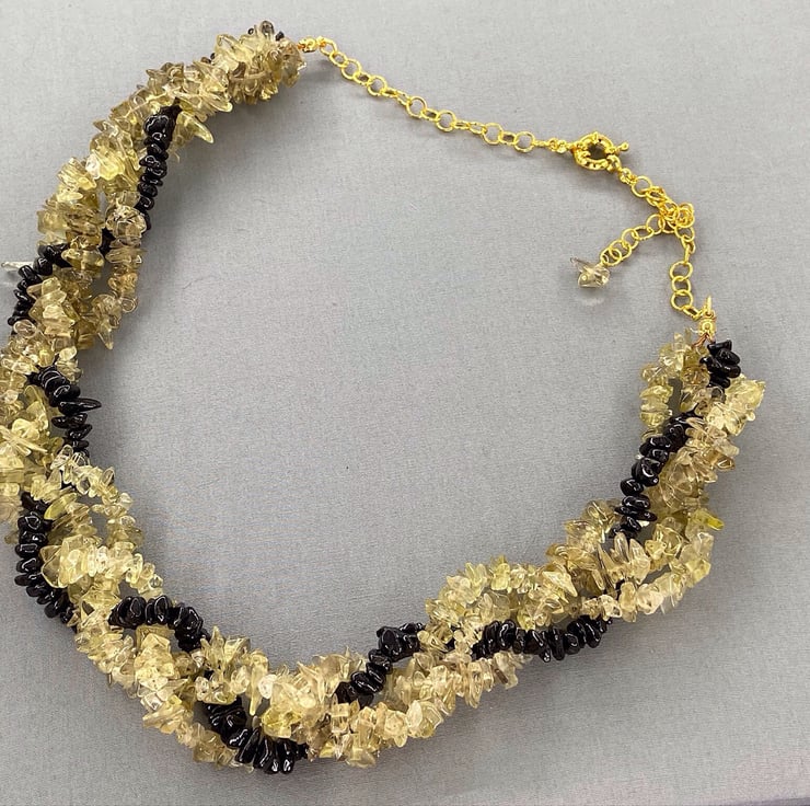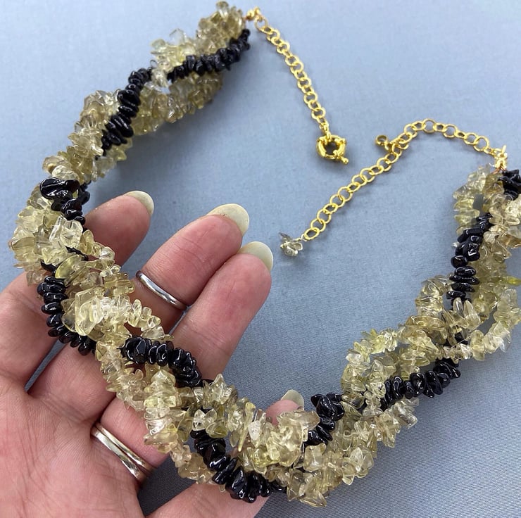 A lovely chunky boho style necklace featuring lemon quartz and black spinel all entwined together like a twisted rope effect which is very comfortable to wear.