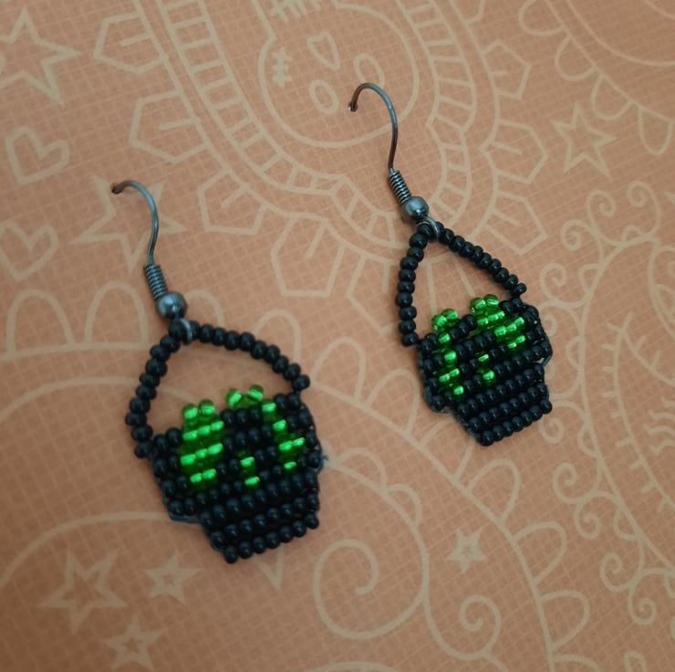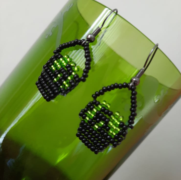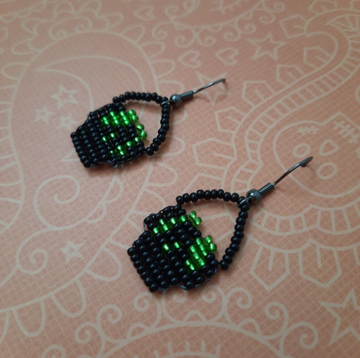 A pair of bead work earrings in the design of a cauldron. They are predominantly black and green and have black ear wires. They have a drop of approx. 2.5cm from the base of the ear wire and are approx. 2cm wide.