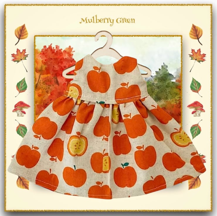 A cute little dress in a lovely linen effect apples design to fit the Mulberry Green characters. The dress is made from best quality cotton and has a full skirt and a lined bodice.
