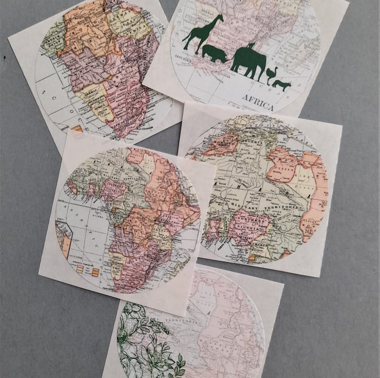 A set of 10 sheets of A5 size handmade letter writing / notepaper set based upon a vintage map of Africa, which I have added to in order to create a collage. The map has been made feint in the background so that it doesn't interfere with your handwriting.