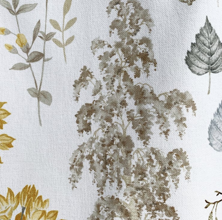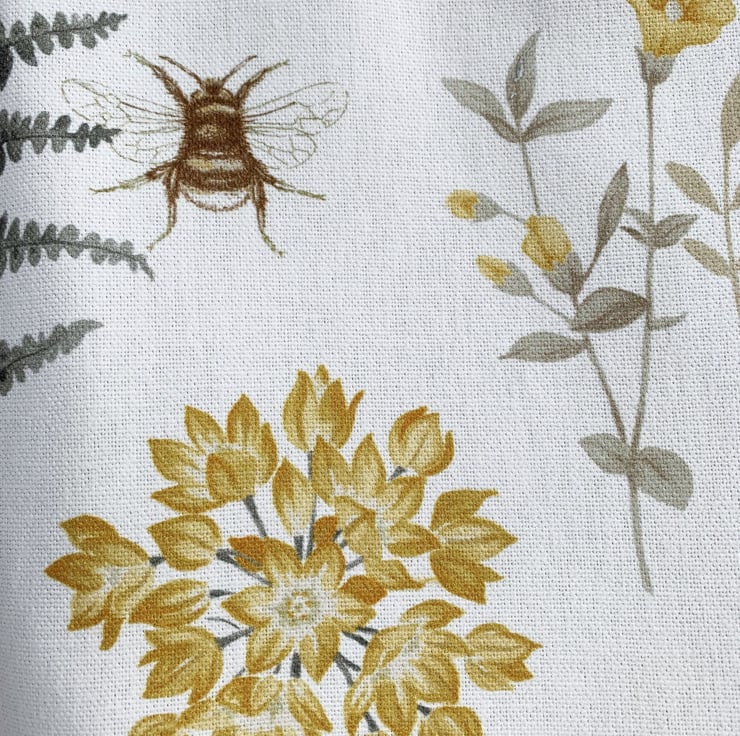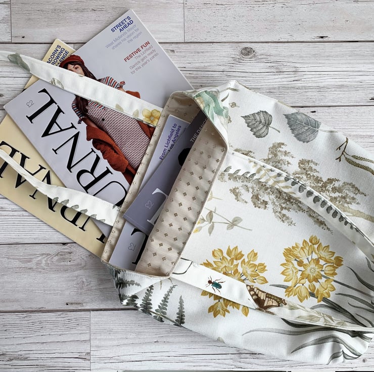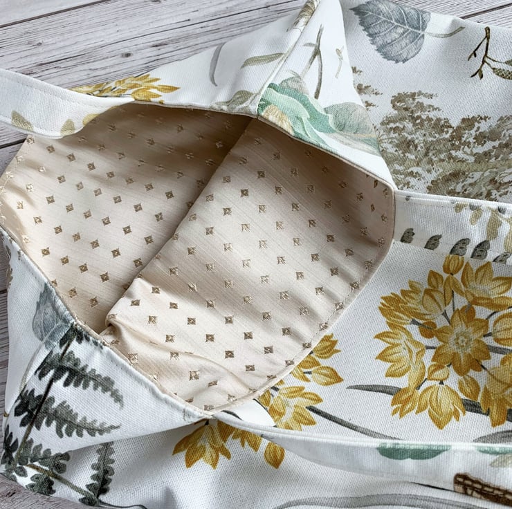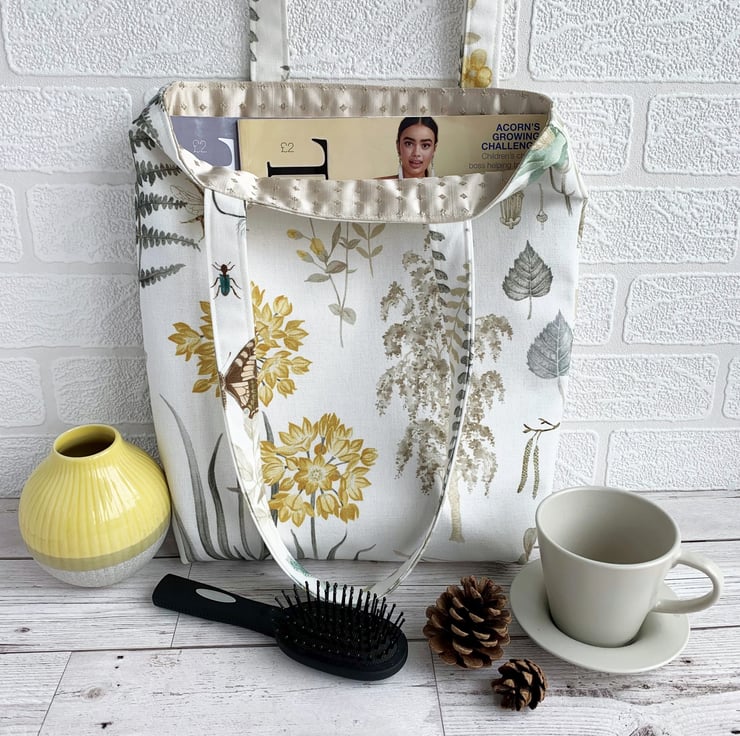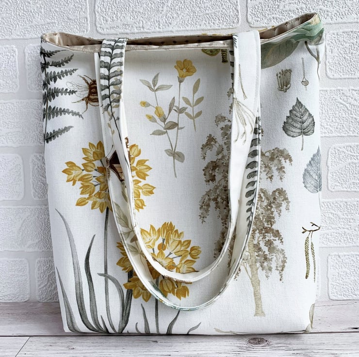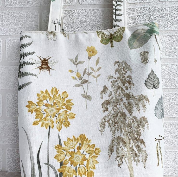 Botanical print tote bag. This delightful tote bag is made from pretty botanical print fabric with a pattern featuring pictures of British plant-life on a white background. The pattern shows numerous botanical motifs including a beautiful beige birch tree, a pale blue birch leaf, beige catkins, golden-yellow flowers, a brown and beige bee and a green moth. The wildlife is beautifully illustrated and the colours are subtle and pretty. The bag is lined with lovely pale gold satin with a woven pattern of tiny diamonds.