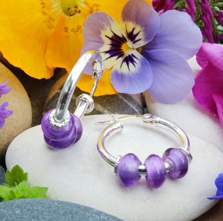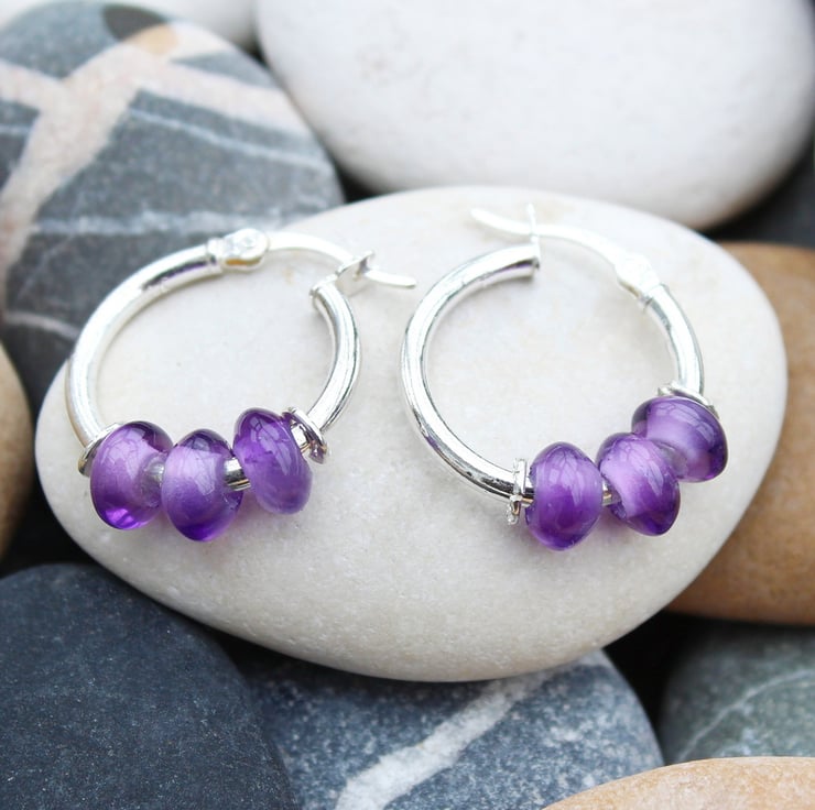 These sleeper hoop earrings have been handmade by us in our workshop in Yorkshire. The earrings are made from 925 sterling silver and measure 18mm in diameter and they feature three 6mm natural Amethyst gemstones. The drilled holes in the Amethyst have been cleverly covered with small decorative silver hoops.