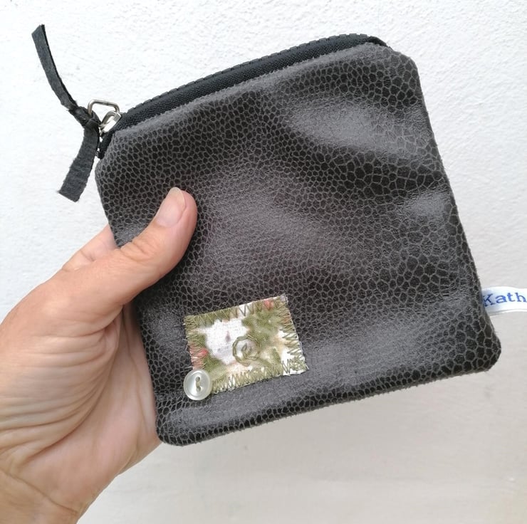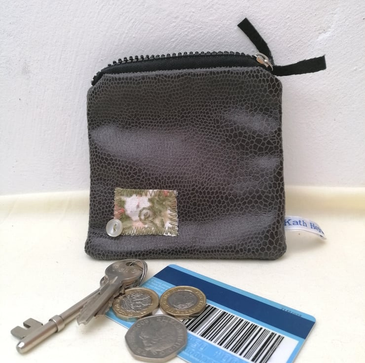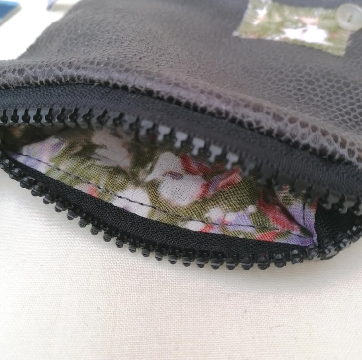 A handmade up-cycled coin purse with a zip fastening.