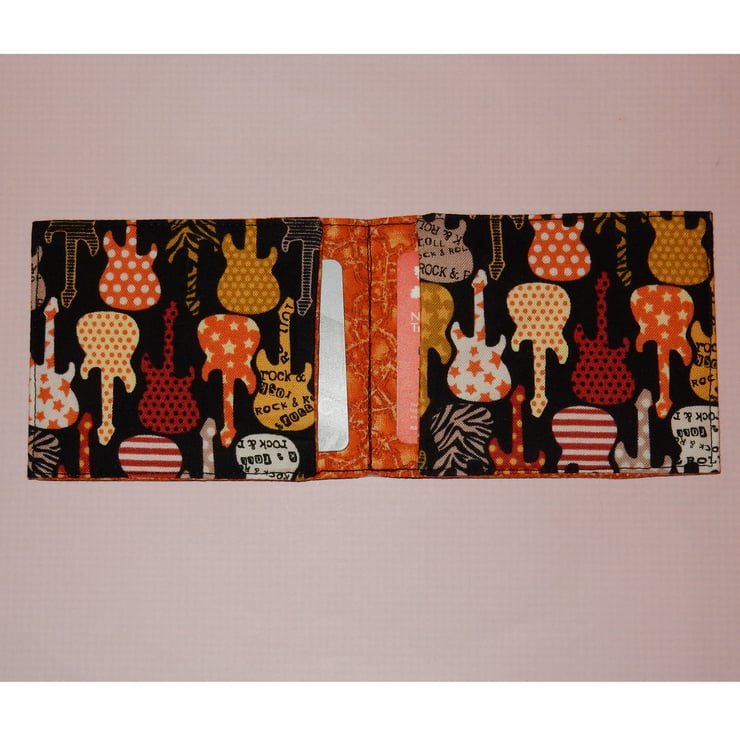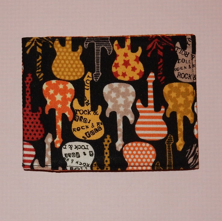 This fun card wallet would make a great gift for musicians or music lovers. The wallet is ideal for travel cards, Oyster cards, bus pass, train tickets and credit cards. It measures approx. 3.5 x 3 inches folded and 7.5 inches open. It is made from cotton fabric, and lined in a toning orange print fabric.