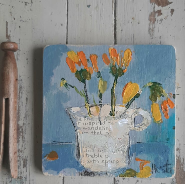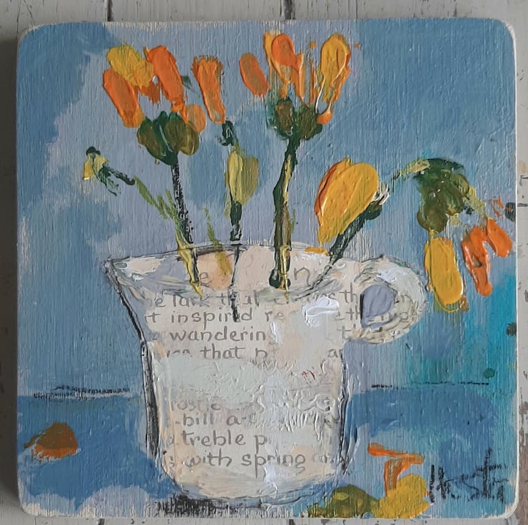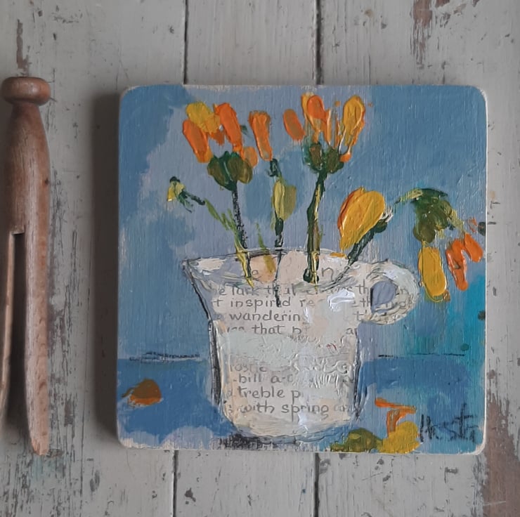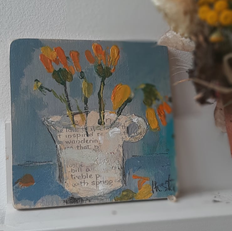 Calendula flowers in a jug. mixed media, painting and collage. The orange flowers pops against the blue. Small sweet painting measuring just 12 cm square. Painted on reclaimed wood, singed, lightly varnished and ready to hang . By artist hesta singlewood aka bodkincreates on Instagram. Hope you like this original art