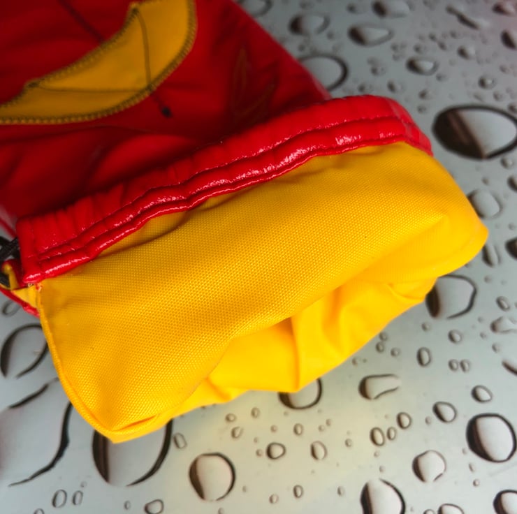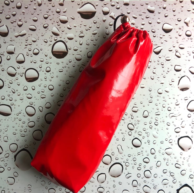 Created from a red pvc fabric with a yellow waterproof lining. A yellow umbrella shape in the same lining fabric has been appliquéd