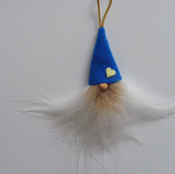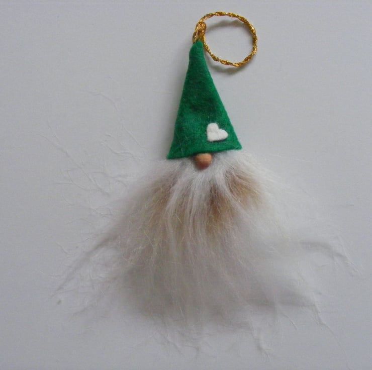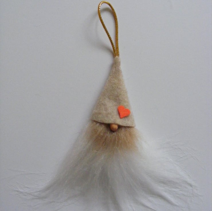 These cute little gnomes are made from wood slices. They have felt hats, clay noses and faux fur beards. They have a heart on hats and gold hanging loop.