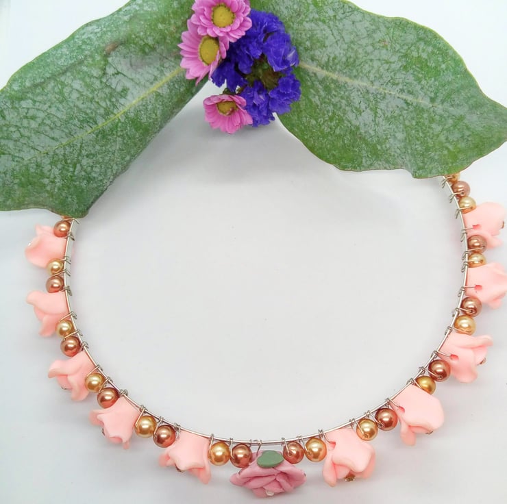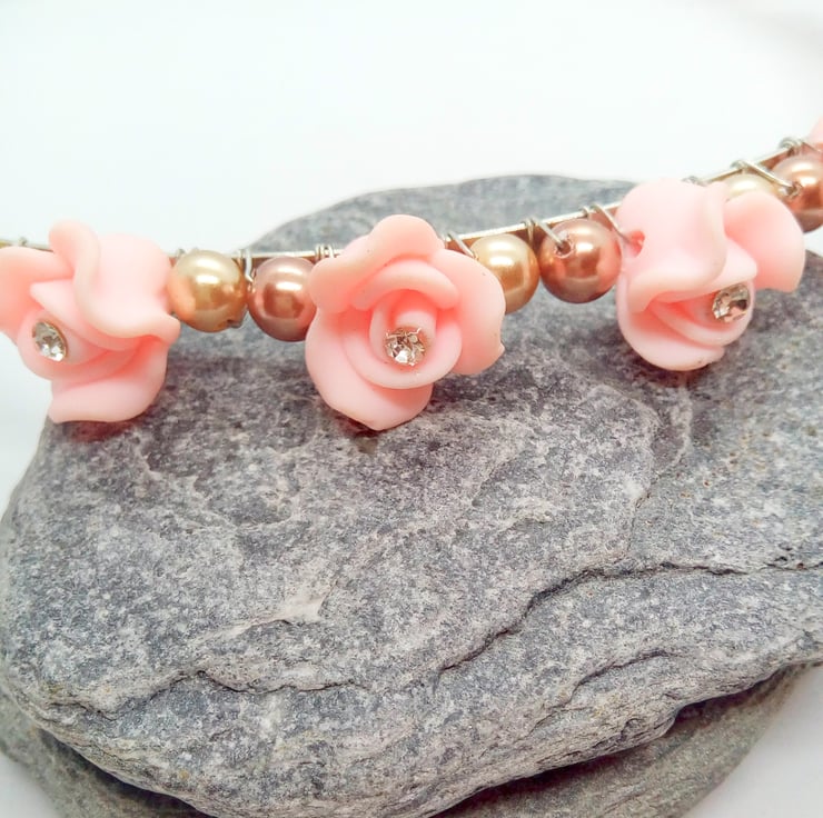 The head band is on a silver plated flexible base and has flowers made from 15 mm x 15 mm pale pink polymer clay roses and a larger 25 mm x 25 mm dusky pink rose in the centre. Each of the smaller pale pink roses has a sparkly rhinestone at it's centre. The tiara base is also decorated with 6 mm bronze and gold pearl beads.