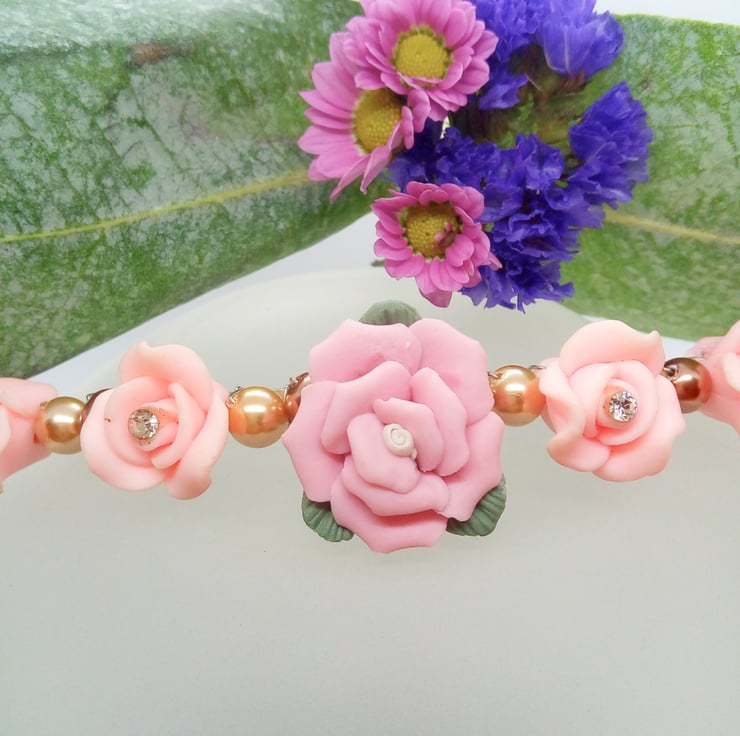 Headband made with Clay Roses with Rhinestone Centres and Gold and Bronze Pearls, Rose Headband, Pink Headband, Tiara, Prom Night, Hair Accessories, Gift for Her
