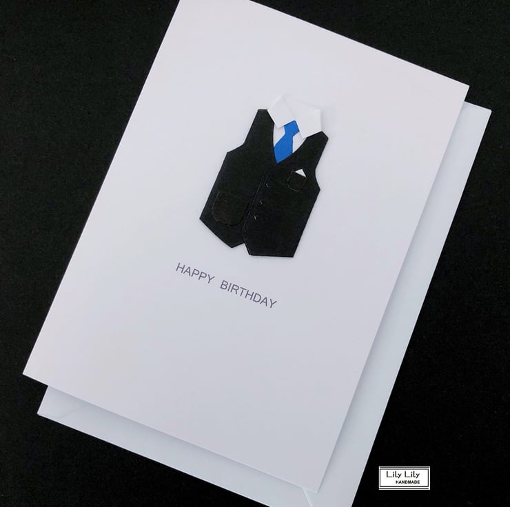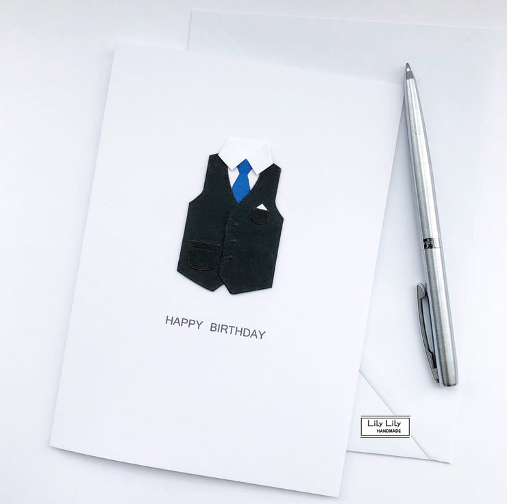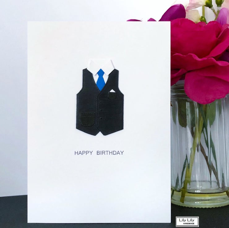 A contemporary birthday card featuring a smart black waistcoat, white collared shirt and blue tie design by Lily Lily Handmade. This card design is particularly ideal to send your birthday wishes to a male friend or relative. The card features the wording 'Happy Birthday' on the front of the card.