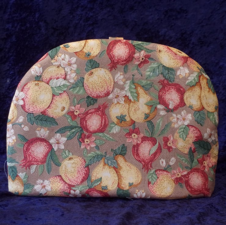 The fabric used has a design of Apples, Pears, Pomegranates, leaves and flowers on a dark beige background. It is lined with wadding, which has been stitched to the cream lining to prevent it from bunching up when it is washed.