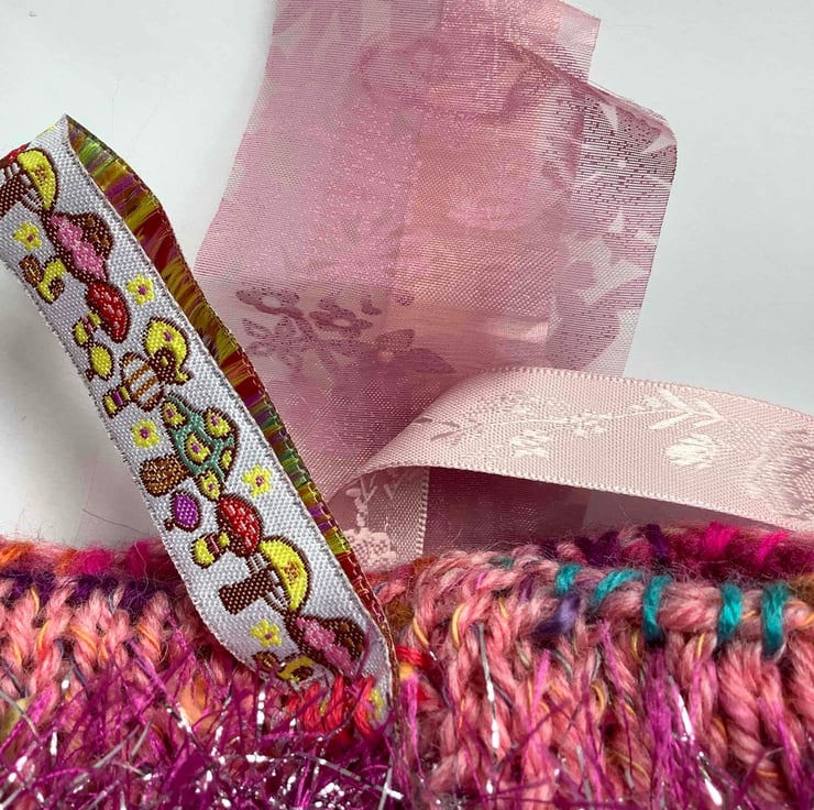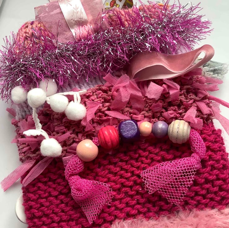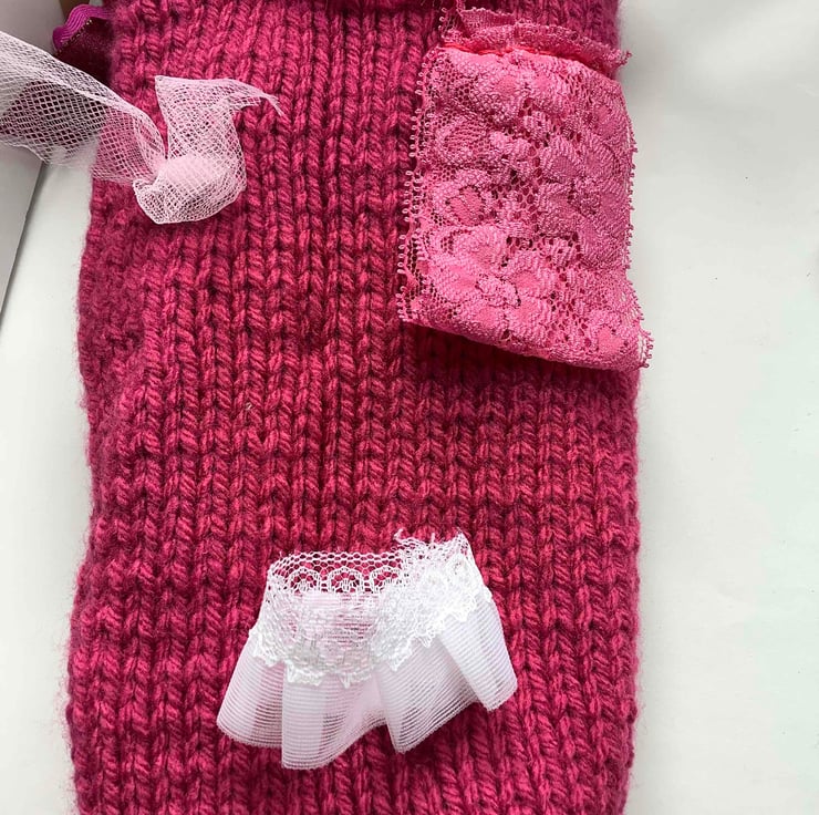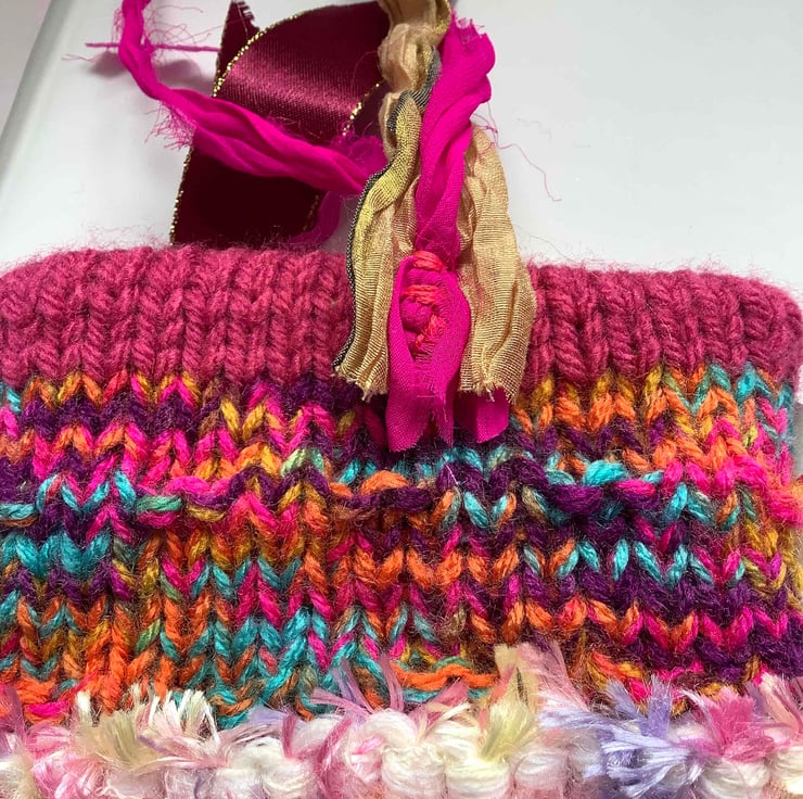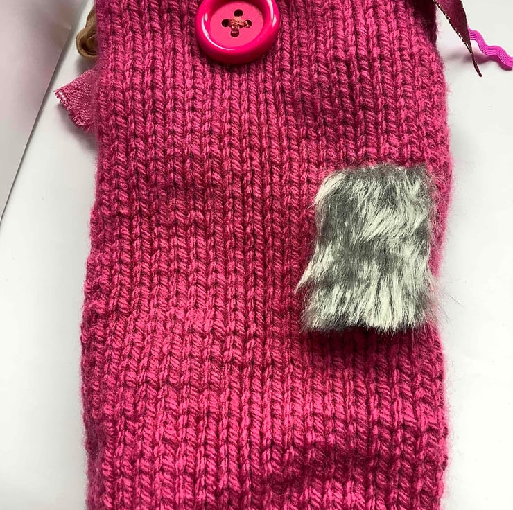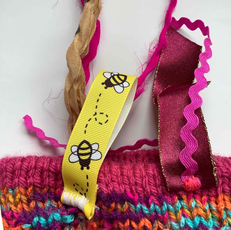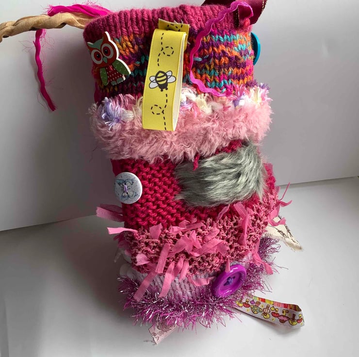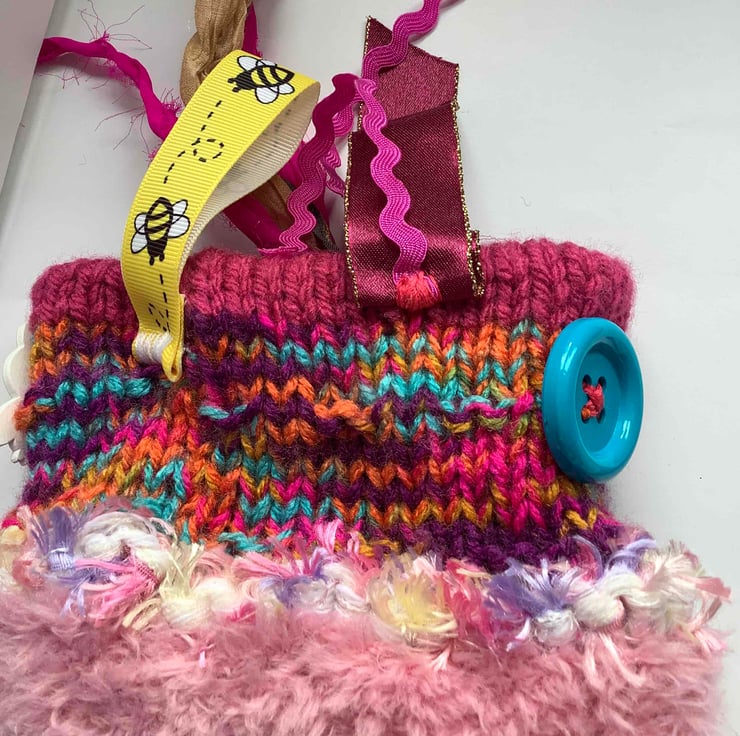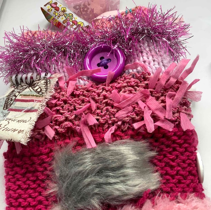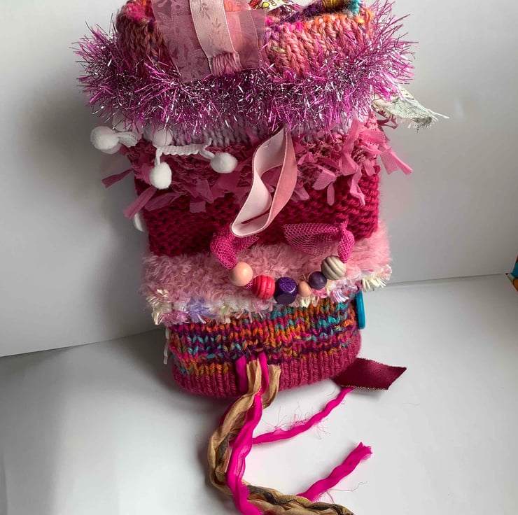 This muff is made from a variety of wools and yarns and adorned with buttons, braids, ribbons, textiles and beads.