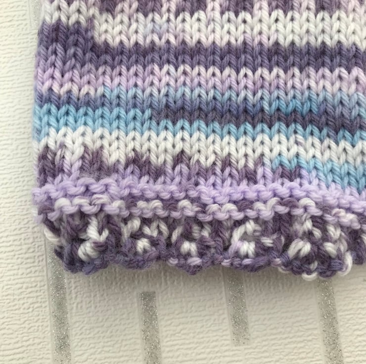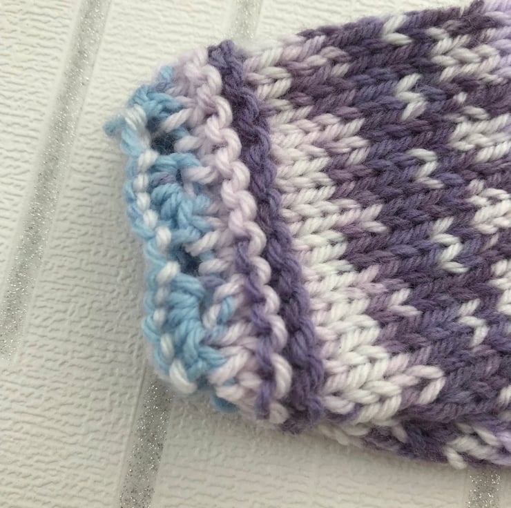 The yarn is 55% nylon 45% acrylic and has shades of purple, turquoise and white.
