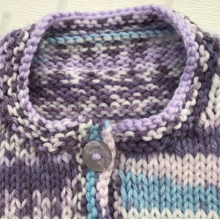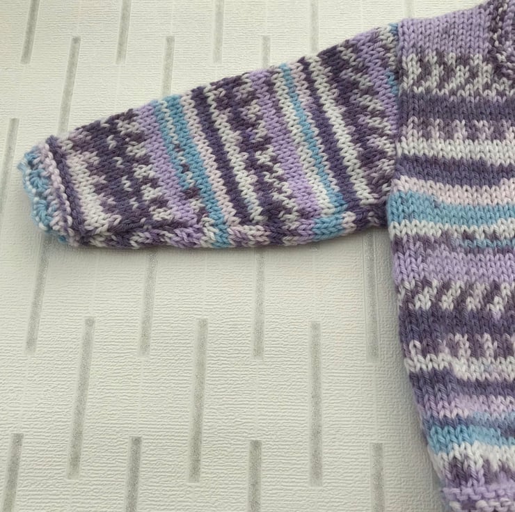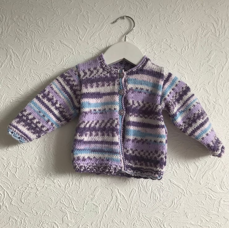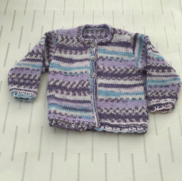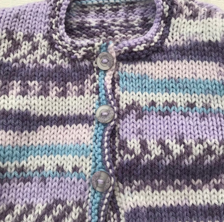 This pretty cardigan is hand knitted in a variegated synthetic yarn which imitates fair isle when finished. It has shell patterned hems on the body and sleeves and garter stitch bands at the front and neck edge. It fastens with three buttons at the top.