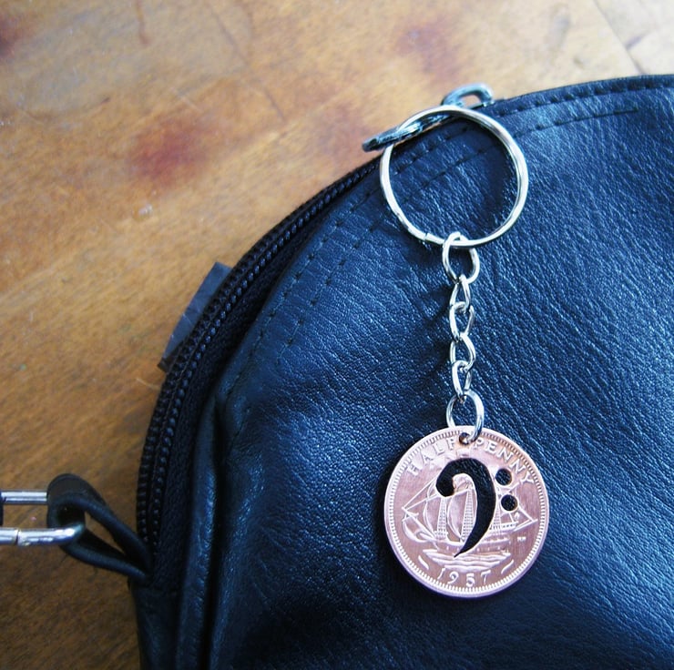 A bass clef musical note pierced into a 1957 bronze halfpenny, with a jeweller's saw (NOT laser cut). 2.5 cms across. I have used the ship on the reverse of the coin as the front.