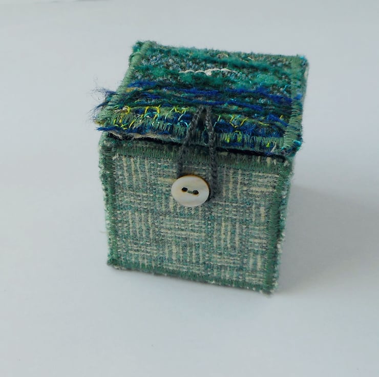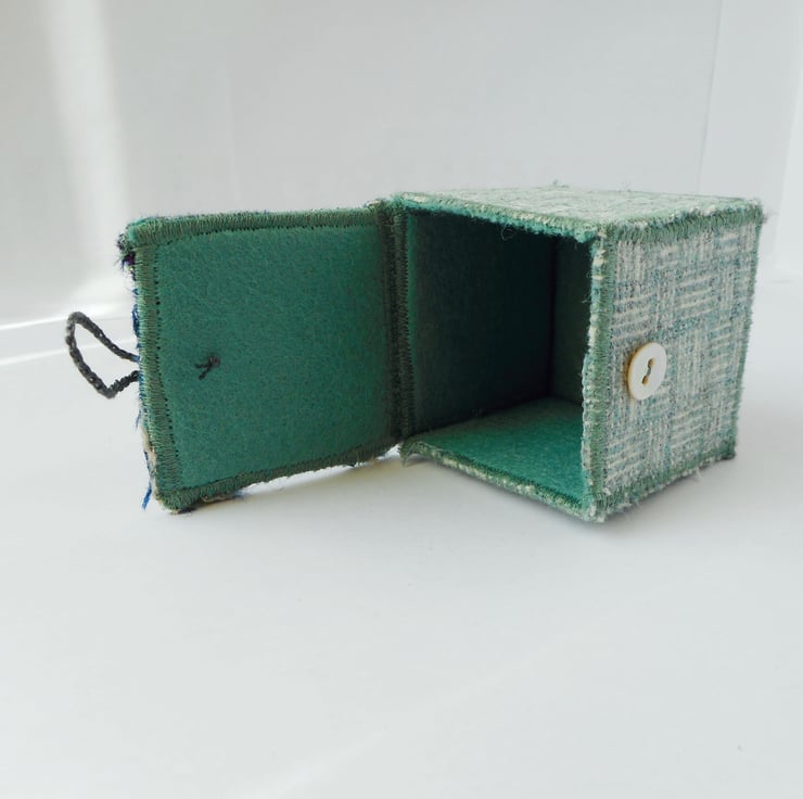 The box is fully lined in wool felt in a co-ordinating colour. A recycled shell button has been securely stitched to the front and is used with a loop of matching thread to close this treasure box.