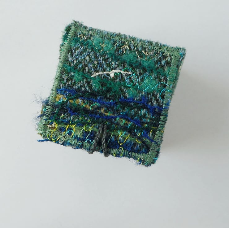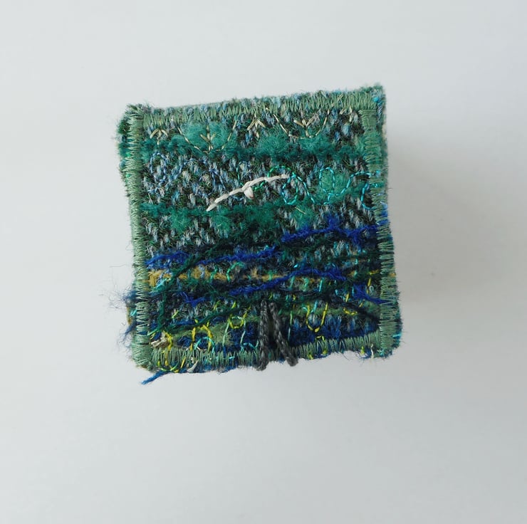 The lid is made from a handmade textile based on an offcut of harris tweed. Wool yarn, needlefelting and machine embroidery have been used to build up texture and depth, inspired by winter’s stormy seas. A white sea bird has been embroidered by hand, soaring effortlessly over the waves.