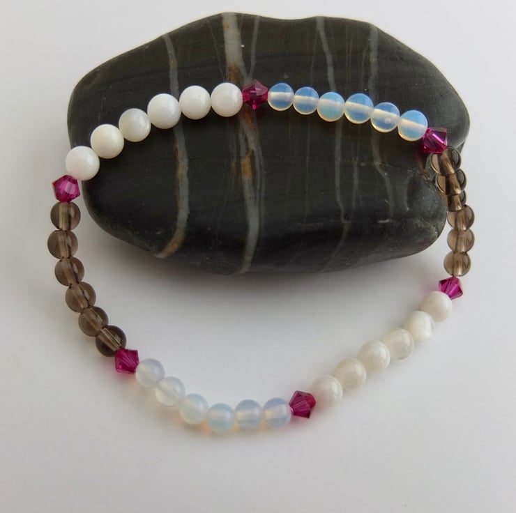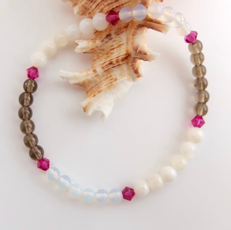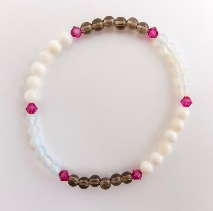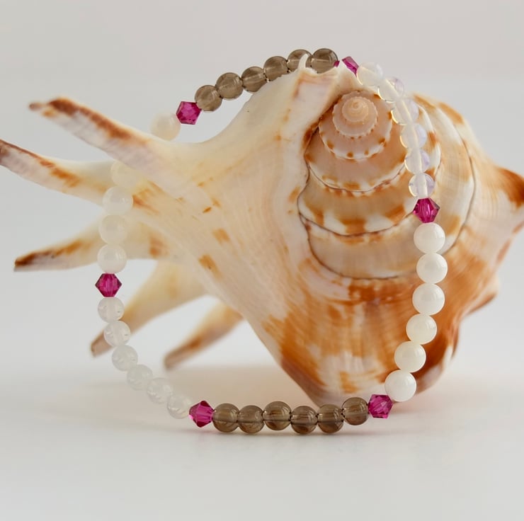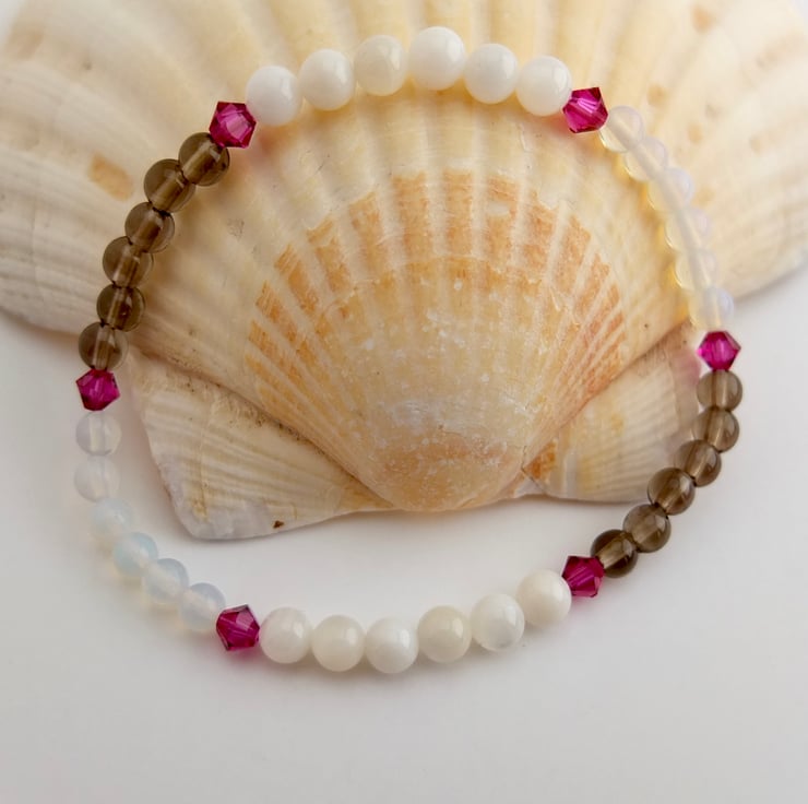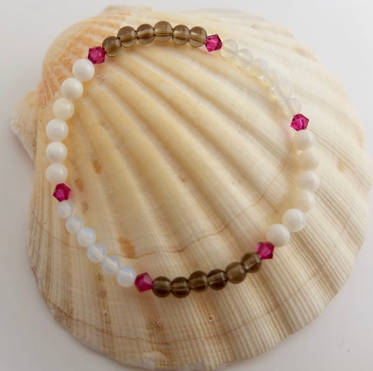 A pretty, dainty stretch bracelet, Smoky Quartz, blue-hued Opalite and white shell beads are separated by sparkly Swarovski bicones in the colour "fuschia".