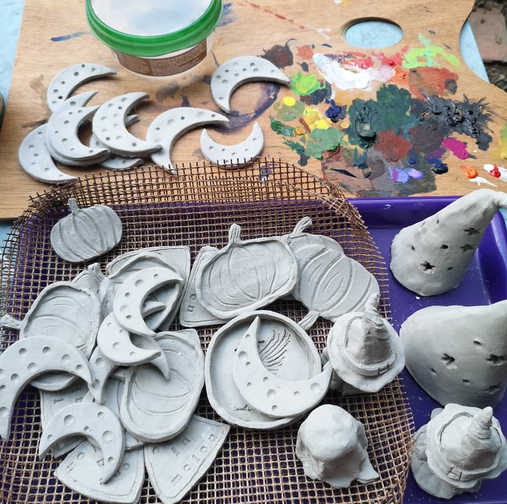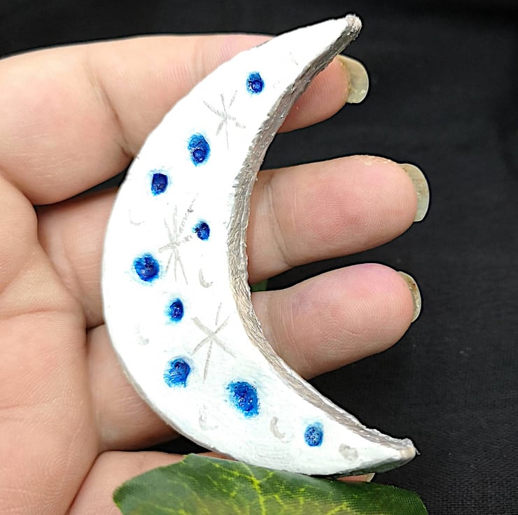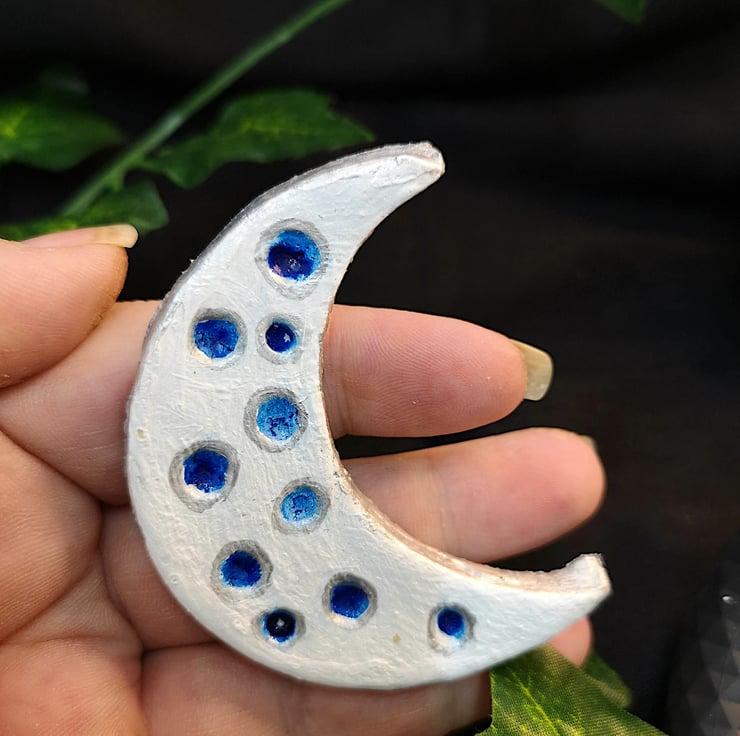Bring the beauty of the crescent moon into your home with a beautiful clay crescent moon magnet. White with accents of blue and silver or gold.