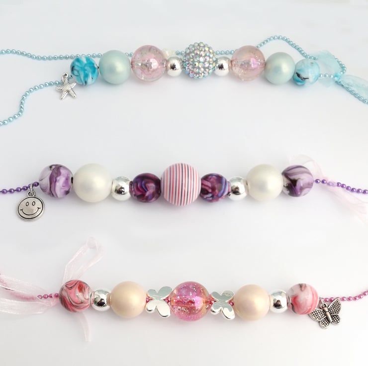 Each kit contains an 9 funky bubble gum acrylic beads in assorted shapes and colours, a 28 inch ball chain, a tibetan silver charm and an organza ribbon.
