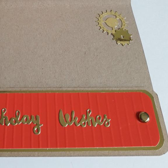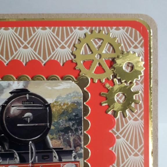 I have placed this topper on a brown patterned background, then red card then a kraft card base, I have added some die cut gold cogs to embellish.