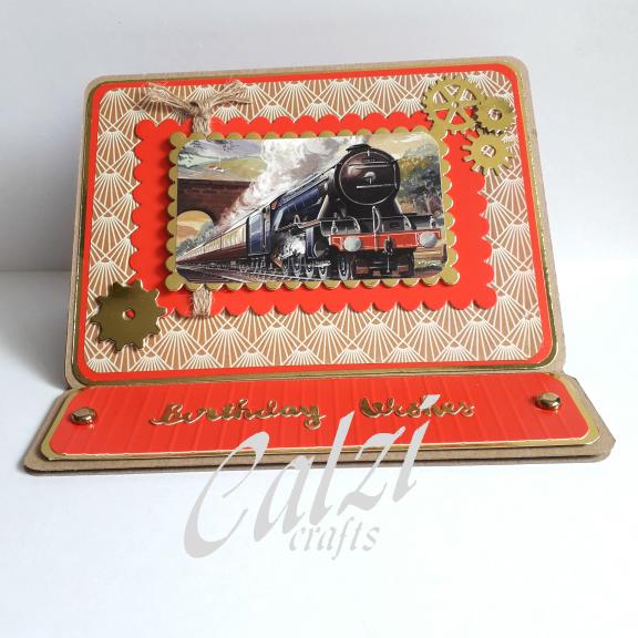 An easel style card which is 18 x 13 cm when flat, it features an image of a steam train in a gold frame then on a red panel.