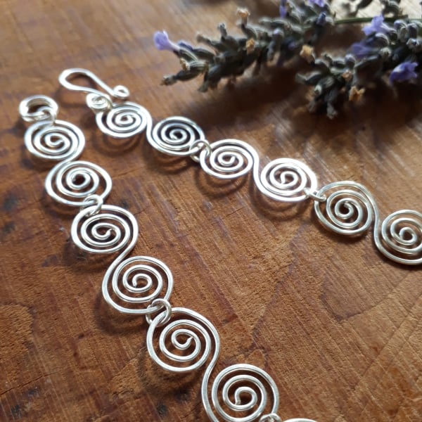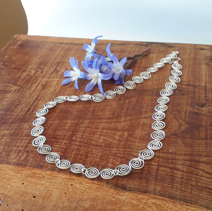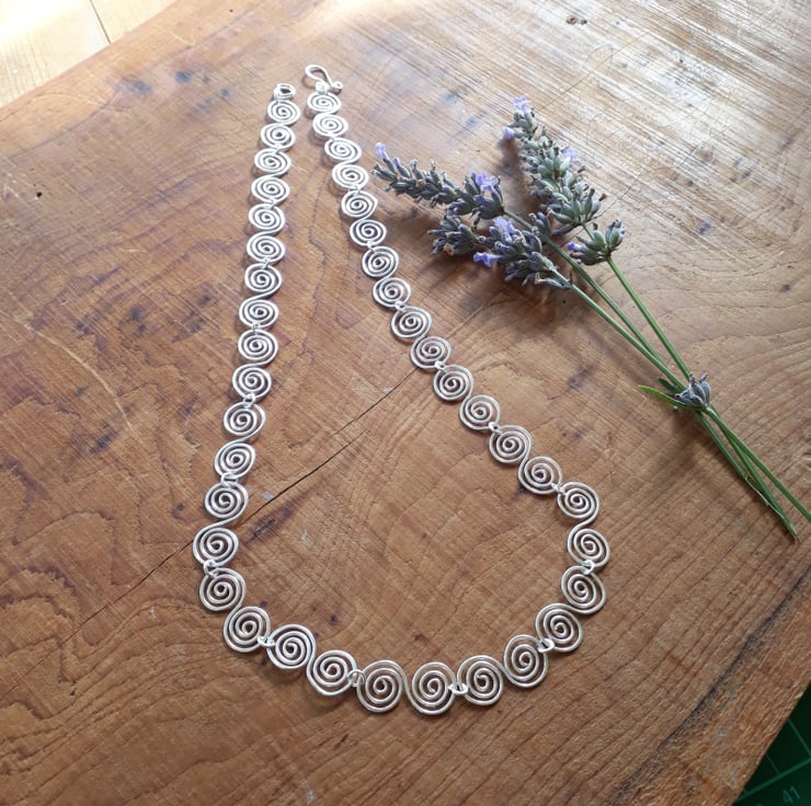Silver wire has been hand shaped into S shaped spirals and connected together to make this stunning stylish necklace. Often compared to a similar necklace worn by Alice Roberts in Digging for Britain.