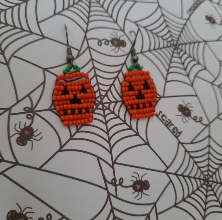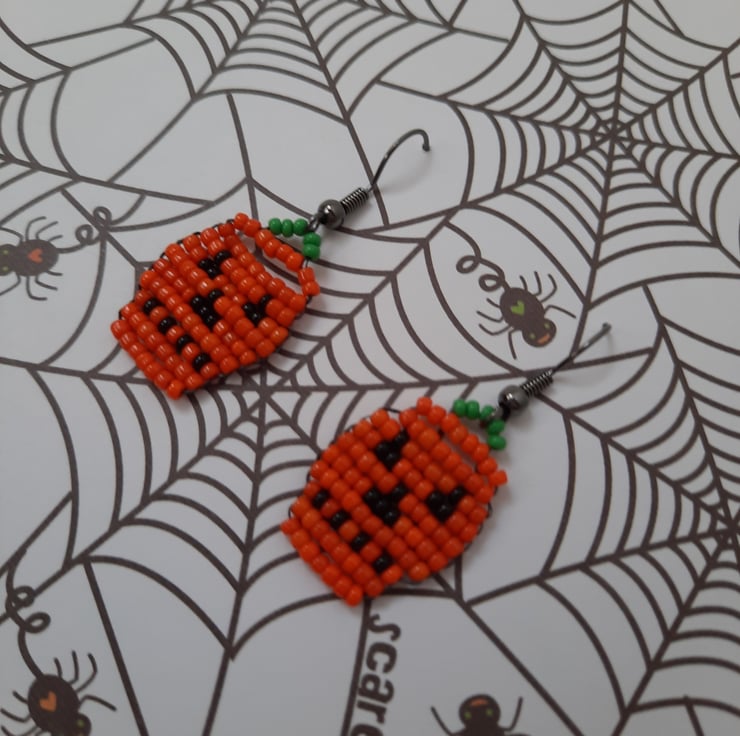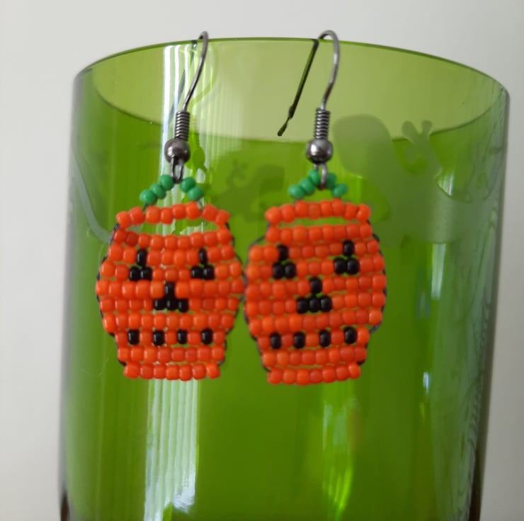 A pair of beadwork earrings in the design of a pumpkin. The Czech seed beads are predominantly orange, black and green and they have black ear wires. They have a drop of approx. 2.5cm and are approx. 1.7cm wide.