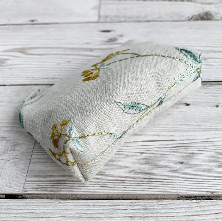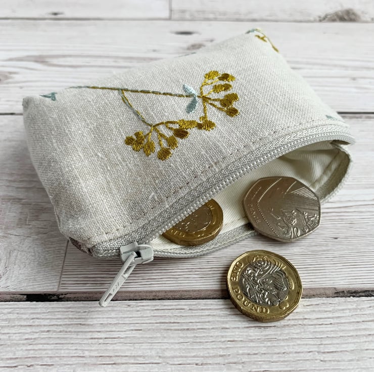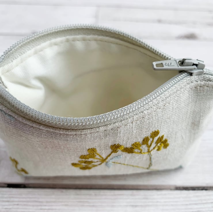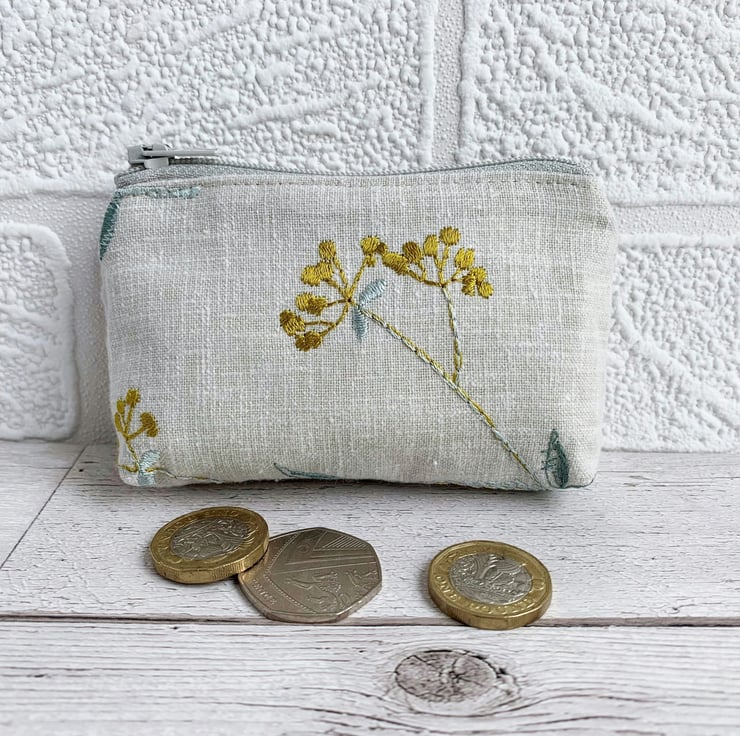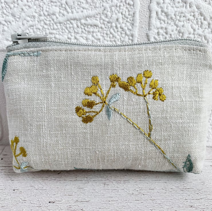 Small coin purse with embroidered umbel flowers. This lovely little purse is made from cream linen-look fabric with a pretty embroidered floral pattern in shades of golden yellow and mint green. The pattern features a spray of embroidered golden yellow umbel flowers on a mint green stem, with mint green leaves. The purse fastens with a pale grey zip and is lined with cream fabric. The corners of the base of the purse are squared off to give more room inside.
