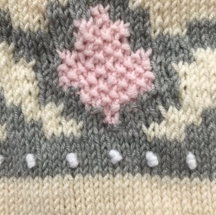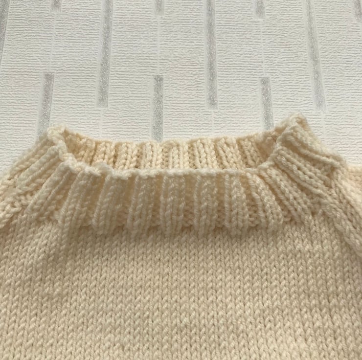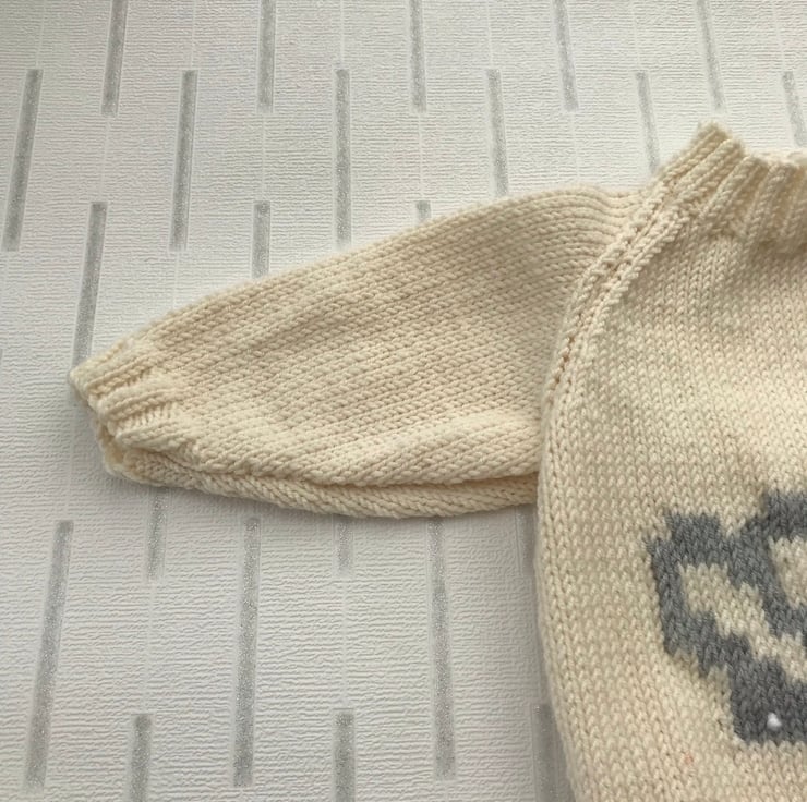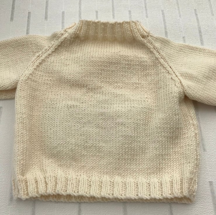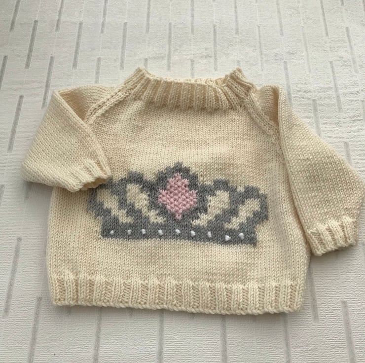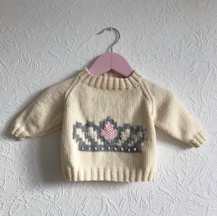 This little jumper is hand knitted in a luxury 100% merino wool. The colour is a deep cream and it has a picture of a crown on the front worked in grey with a pink centre and french knot 'jewels' worked in a white sparkly yarn. It has a ribbed round neck, hem and cuffs.