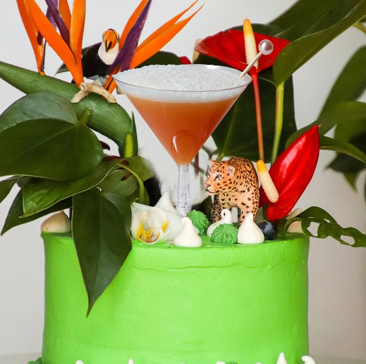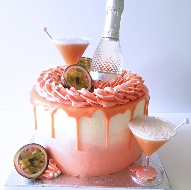 Two decorative fake food pornstar Martini cake toppers display cocktails.