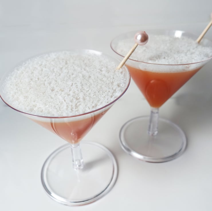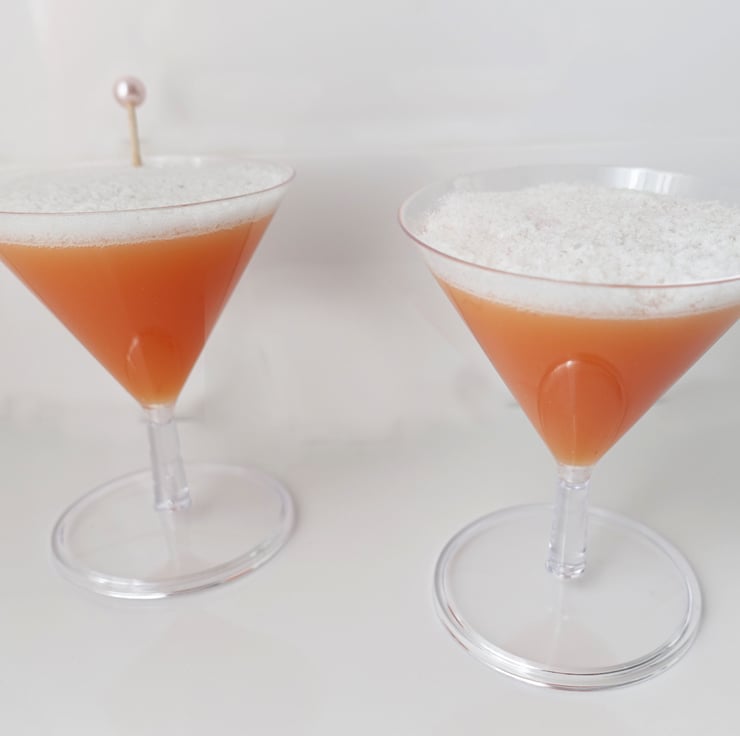 Made from resin with plastic glasses. Peach coloured just like the real cocktails and with the characteristic foam topping. Each has a pearl topped twizzle stick.
