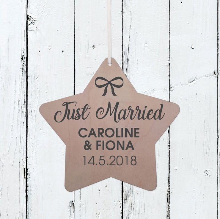 This stylish, contemporary design star plaque features a pretty bow motif and the words 'Just Married', and is personalised with the first names of the wedding couple. Available in a choice of 2 beautiful neutral colours: charcoal grey or white.