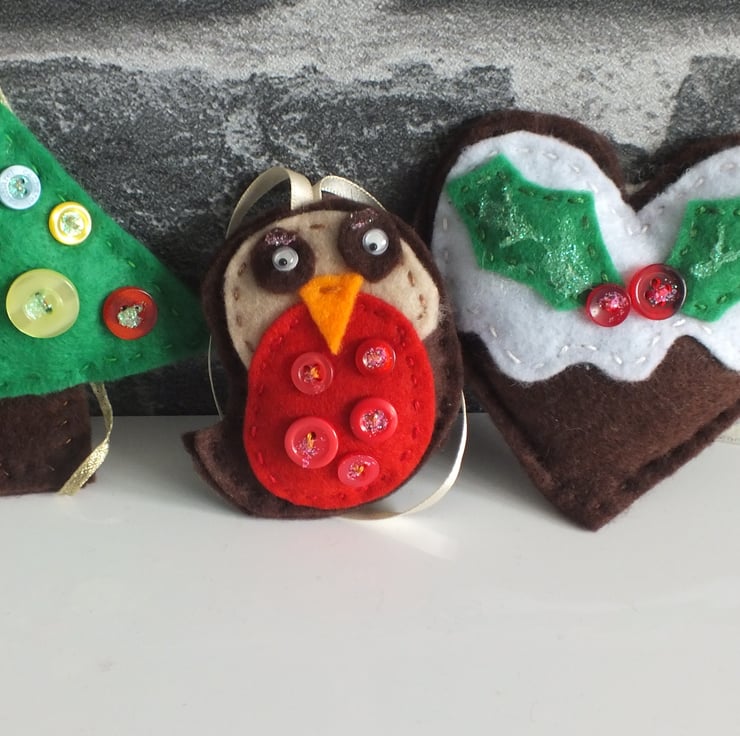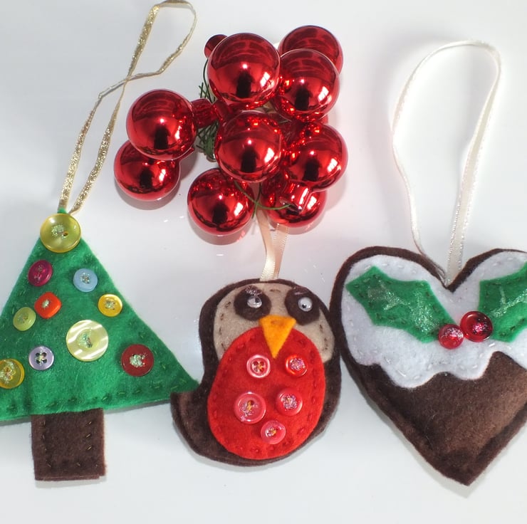 This is a set of three hand cut and hand sewn felt Christmas hanging decorations, suitable for your Christmas tree or use as decorations around your home at Christmas time. You could also use them with a tag on a Christmas present!