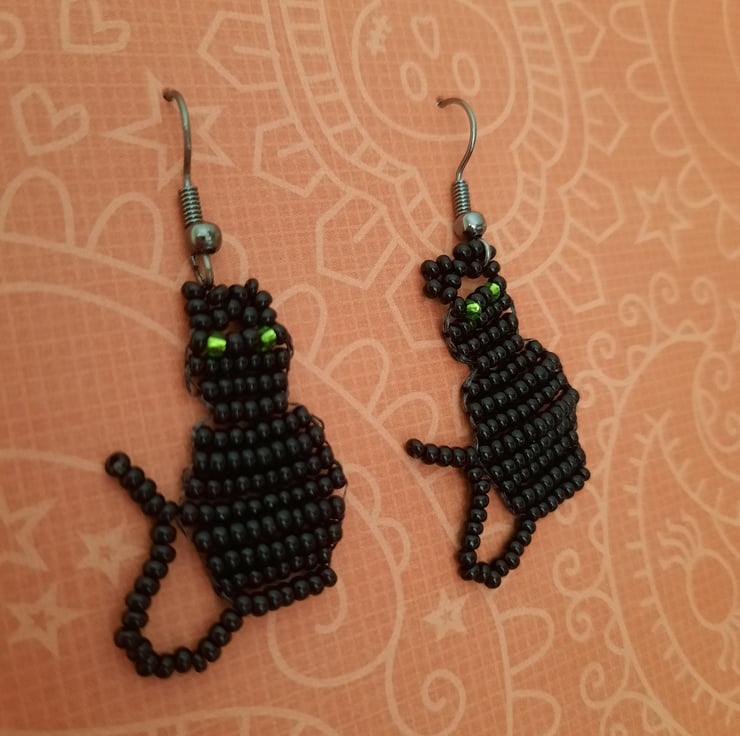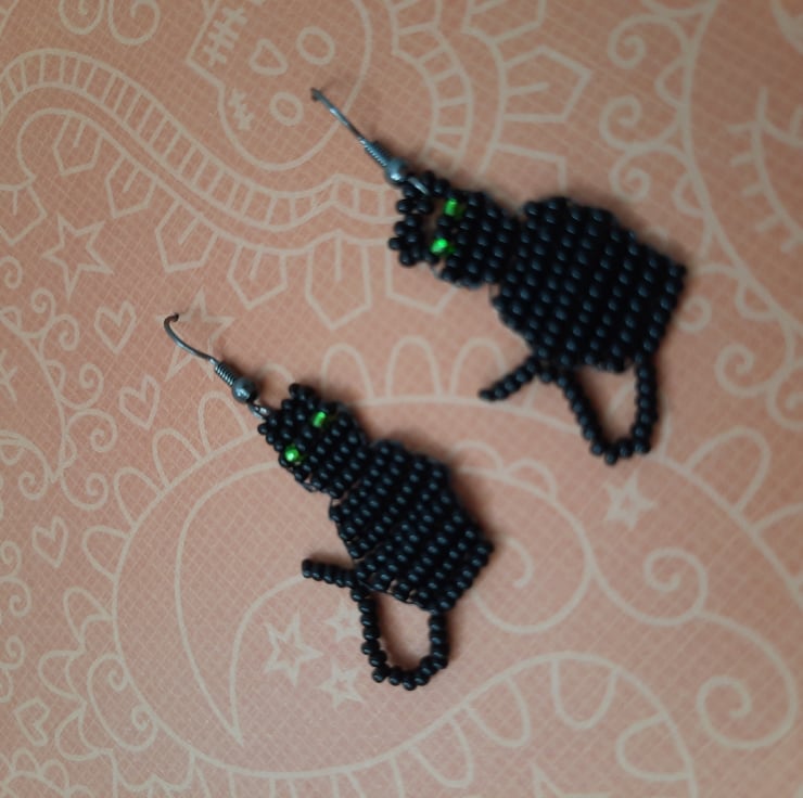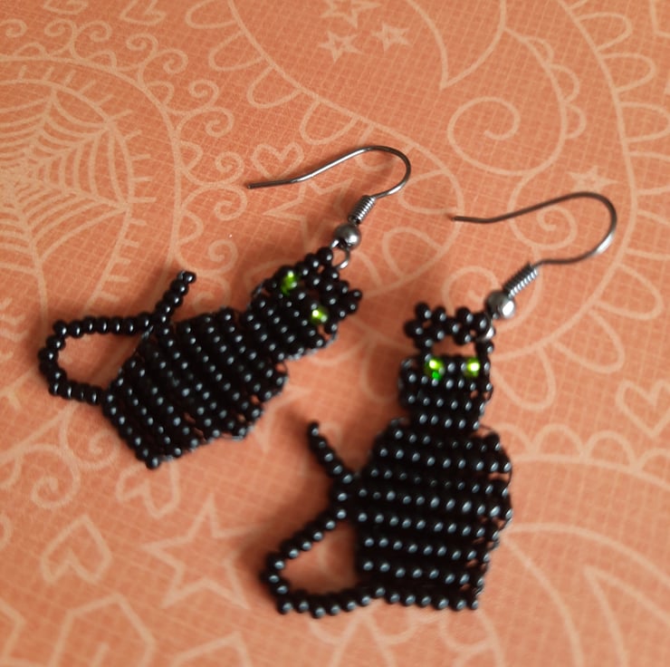 A pair of earrings made using Czech glass seed beads in the design of a cat. The beads are predominantly black and green and the ear wires are black in colour. They have a drop of approx. 3cm from the base of the ear wire and are approx. 2.3cm wide.