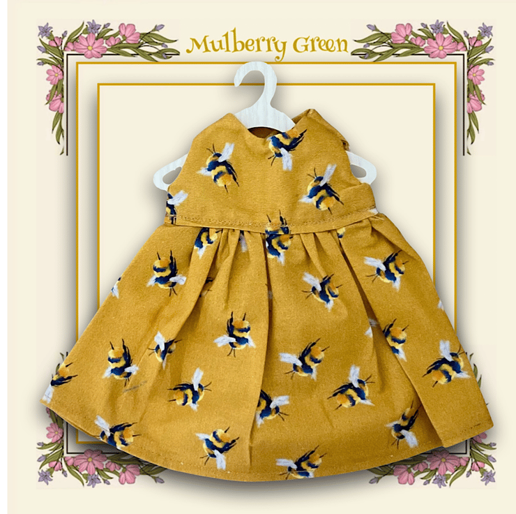 A lovely little dress in a honey bees design to fit the Mulberry Green characters. The dress is made from best quality cotton and has a full skirt and a lined bodice.
