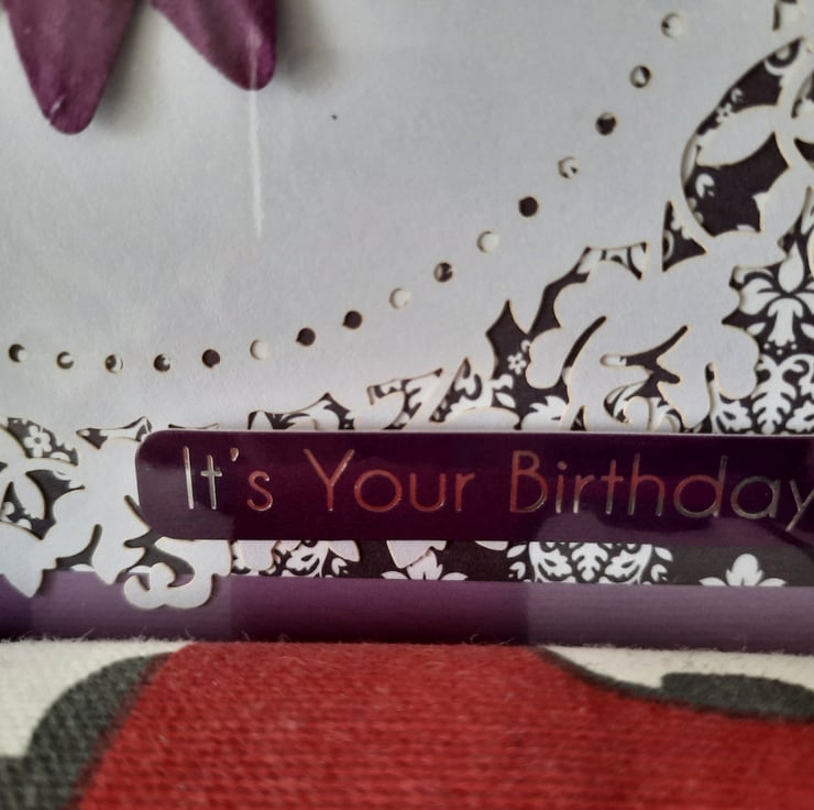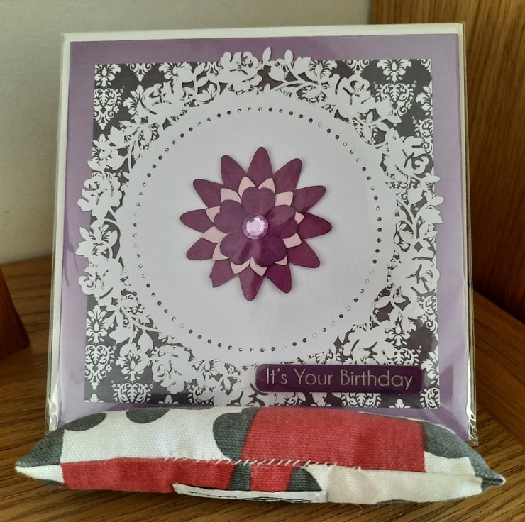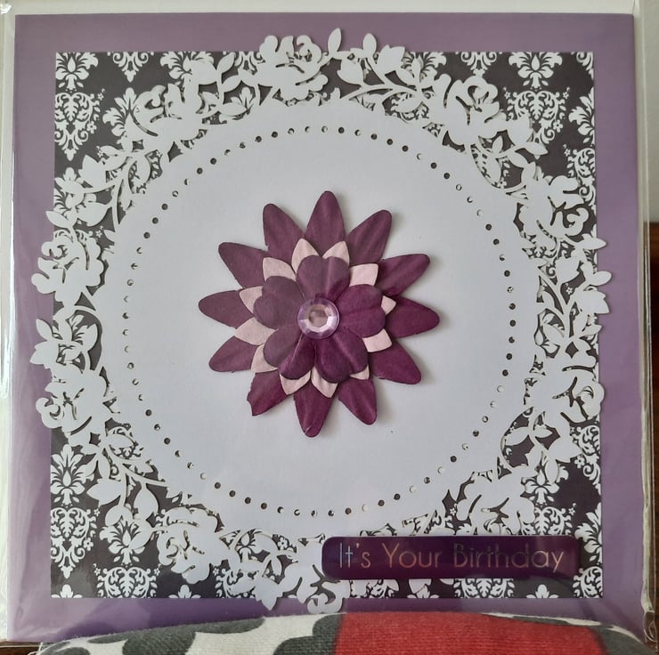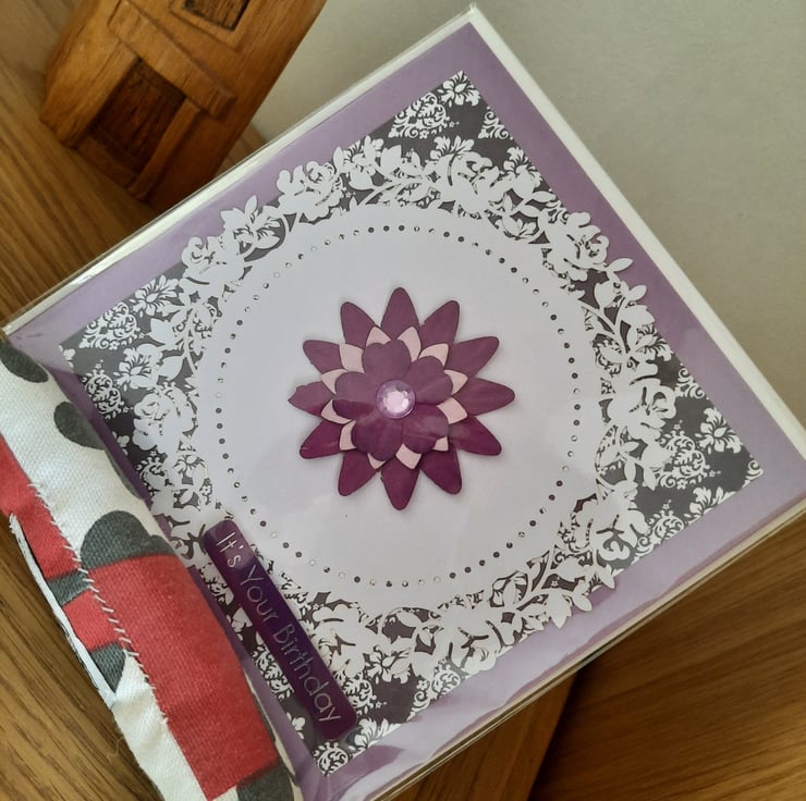 This floral themed birthday card is approx. 15cm x 15cm. It is made with a mix of card and paper in various shades of purple. The inside has been left blank for your own message.