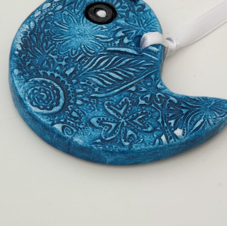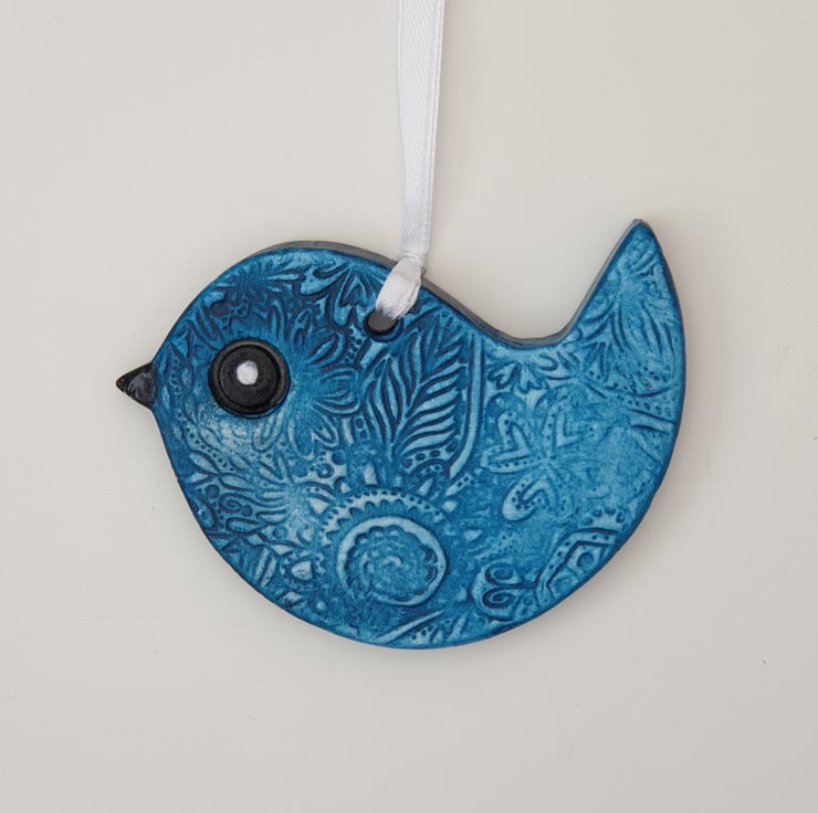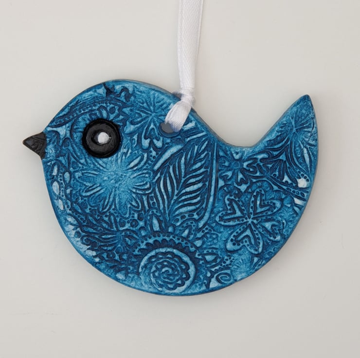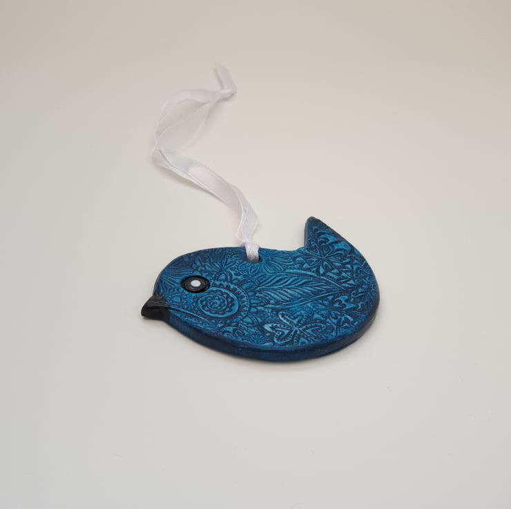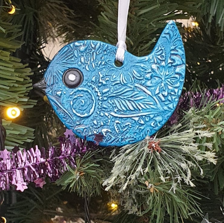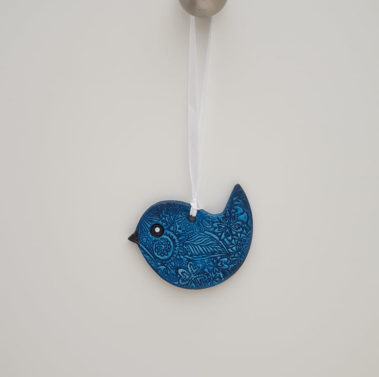 Very cute blue clay bird which has been lovingly handcrafted from air dry clay. The front and back of each bird has been decoratively textured and painted with blue acrylic and then varnished for added protection. The little bird is supplied ready to hang with white satin ribbon and as both sides have been decorated it looks great when hung in a window. This lovely little bird would make a wonderful addition to your home decor all year and would also look great hung on a Christmas tree. This cute little bird would make a lovely gift and comes supplied in a pretty organza bag finished with ribbon.