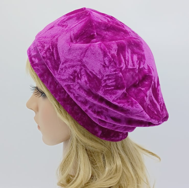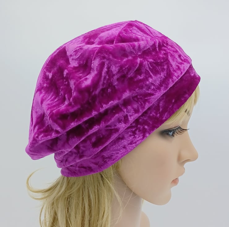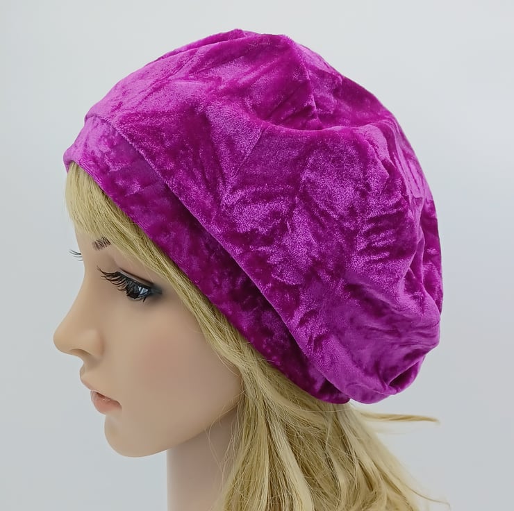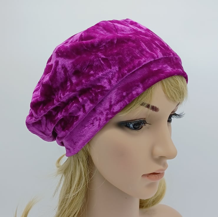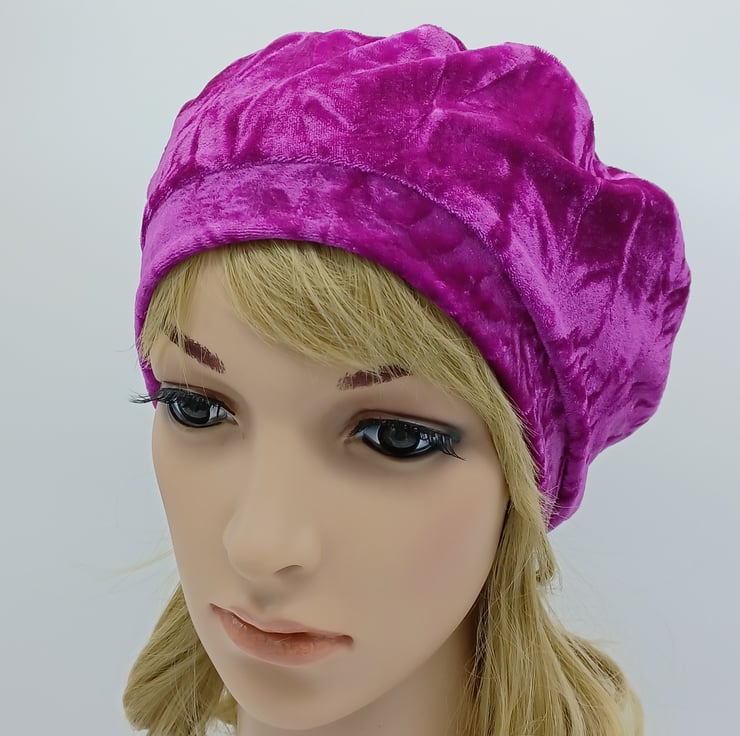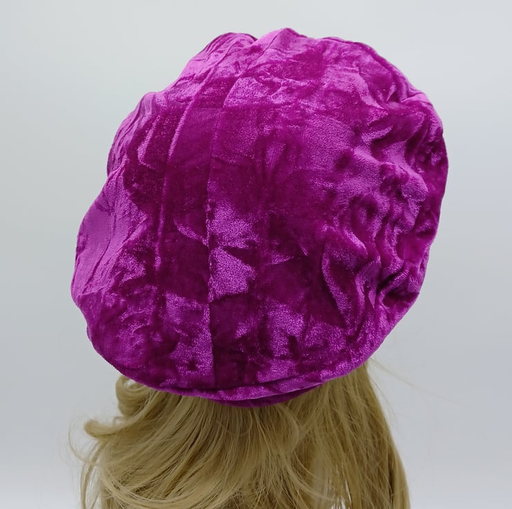 This little beret made from crushed lightweight polyester velvet jersey, it's lined with nylon jersey.