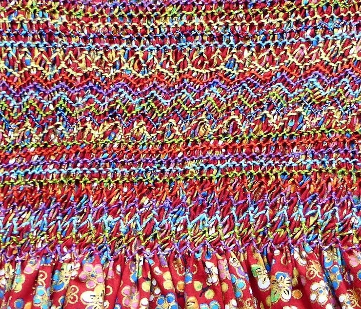 Richly hand embroidered smocked dress, made in cotton poplin. Brightly coloured gold patterned tiny flower design on a rich red background. Capped shoulders to allow for additional warm layer to be worn in winter.